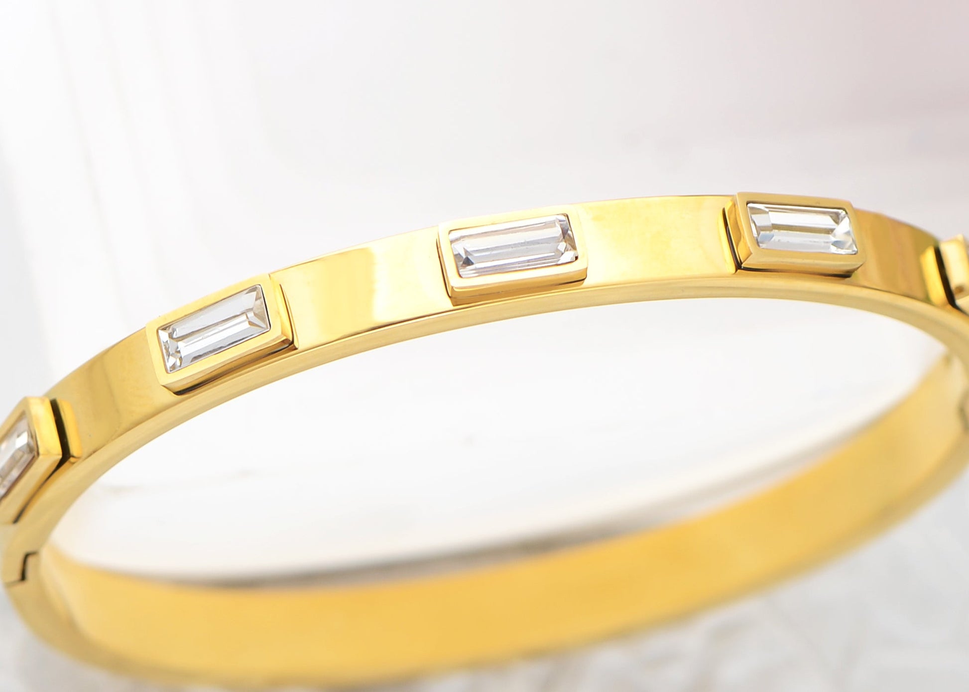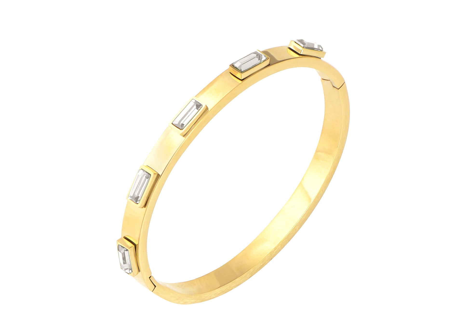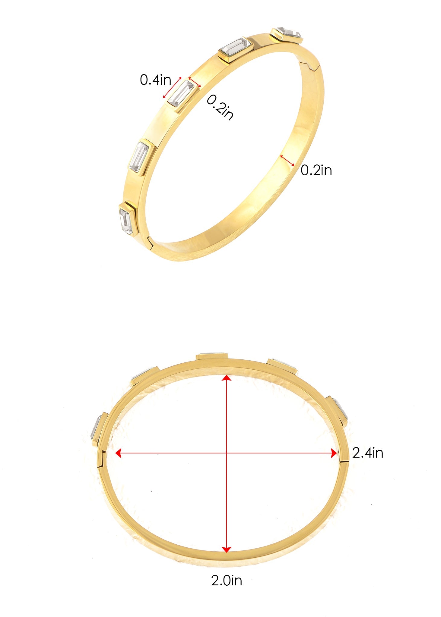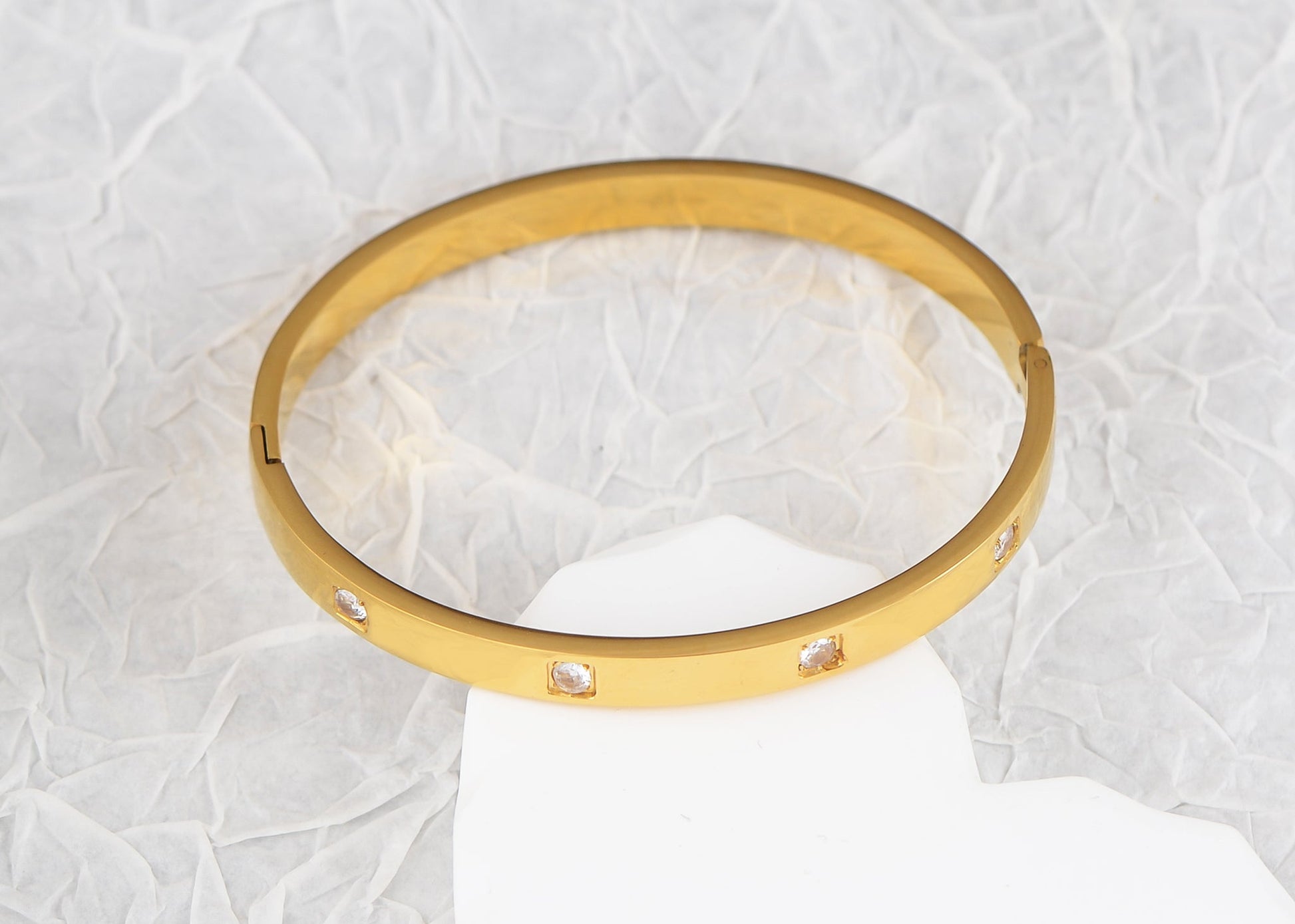 Minimalist Elegance: This gold bangle bracelet features a minimalist design adorned with sparkling round Cubic Zirconia stones, adding just the right amount of elegance without being overpowering. Made from hypo-allergenic surgical grade stainless steel, it promises durability and long-lasting wear