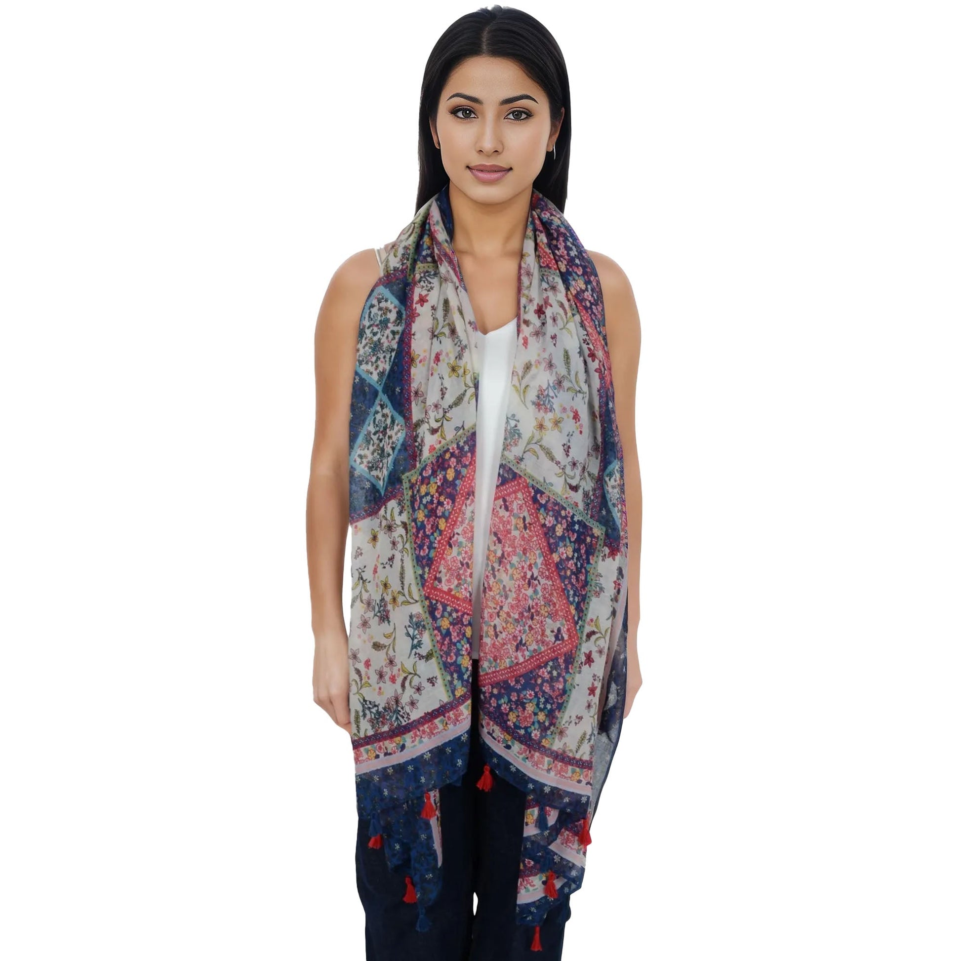 Add a pop of color and chic flair to your wardrobe with this vibrant multi-colored patchwork scarf. Featuring a striking blend of floral, geometric, and abstract prints, this scarf is a versatile statement piece great for any season. Crafted from a lightweight, breathable fabric, it provides comfort whether you???re layering it over a jacket or wearing it on its own. The playful tassel accents add a boho touch, giving it a fun, laid-back vibe. With its generous size, you can wear it in multiple ways???draped around your neck, tied in a knot, or styled as a headscarf. Whether you???re heading to a festival, running errands, or dressing up for a casual night out, this scarf is sure to make a statement. Express your individuality and brighten up any outfit with this must-have accessory.