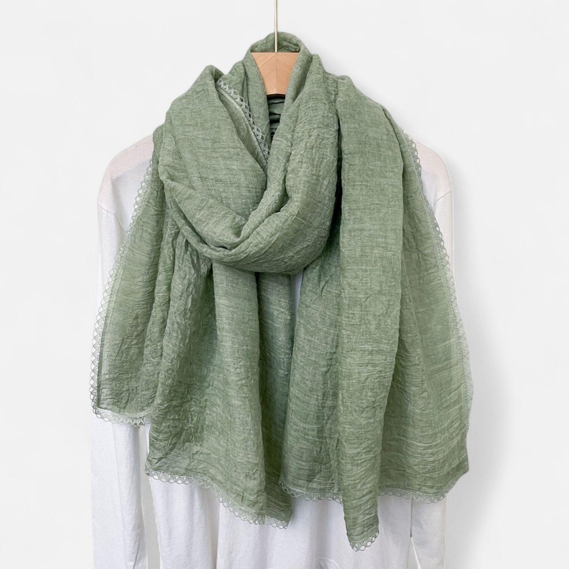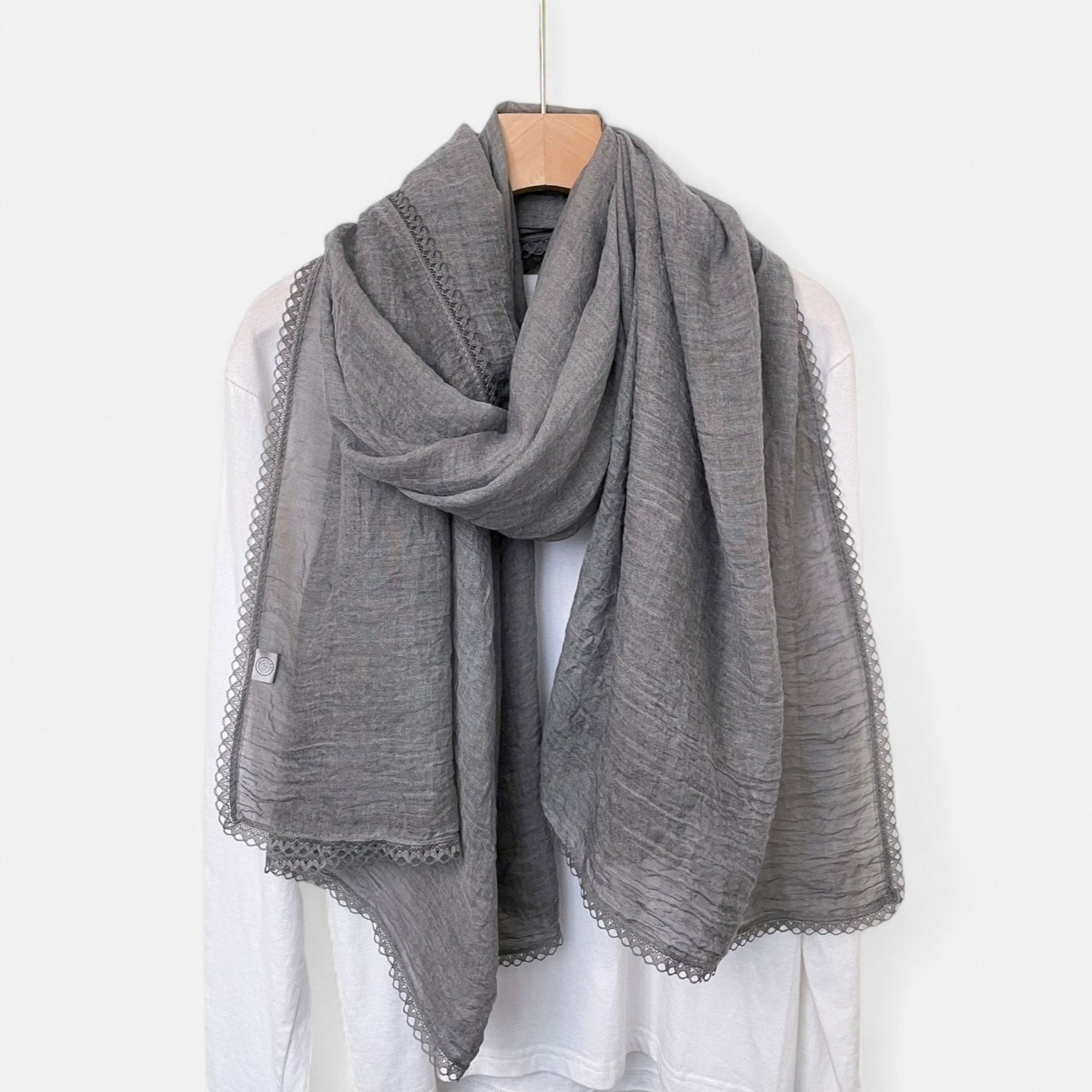 Lightweight Crinkled Wrap Scarf with Delicate Lace Trim Edges