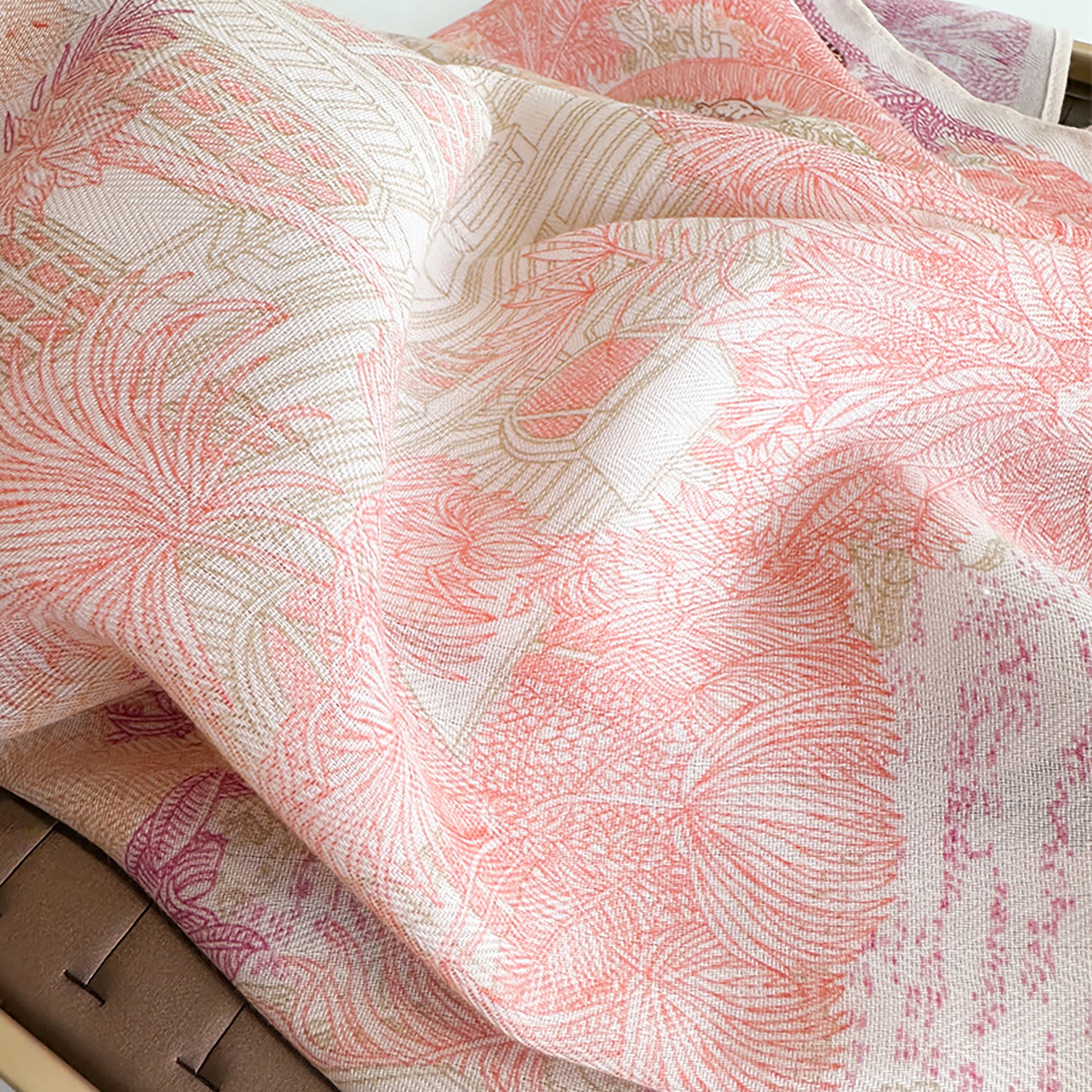 The women's scarf blends artistic sophistication with timeless elegance. Crafted from soft material, it features a detailed botanical and architectural illustration that evokes a sense of refined style. Its smooth texture and elegant drape make it perfect for versatile styling¡ªwhether tied at the neck, wrapped around the hair, or added to a handbag. A beautiful accessory that enhances any outfit with warmth, softness, and artistic flair.