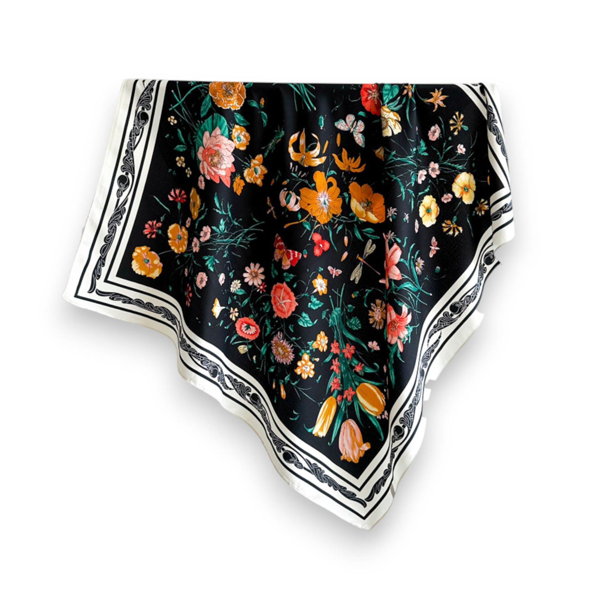 The scarf brings elegance and artistry to your wardrobe. Made from silky twill fabric, this 90x90cm scarf features a vibrant floral design surrounded by a contrasting border for a timeless appeal. Its smooth texture and luxurious drape allow for endless styling possibilities¡ªfrom a neck wrap to a headscarf or handbag accessory. A perfect addition for those who love refined and feminine details.