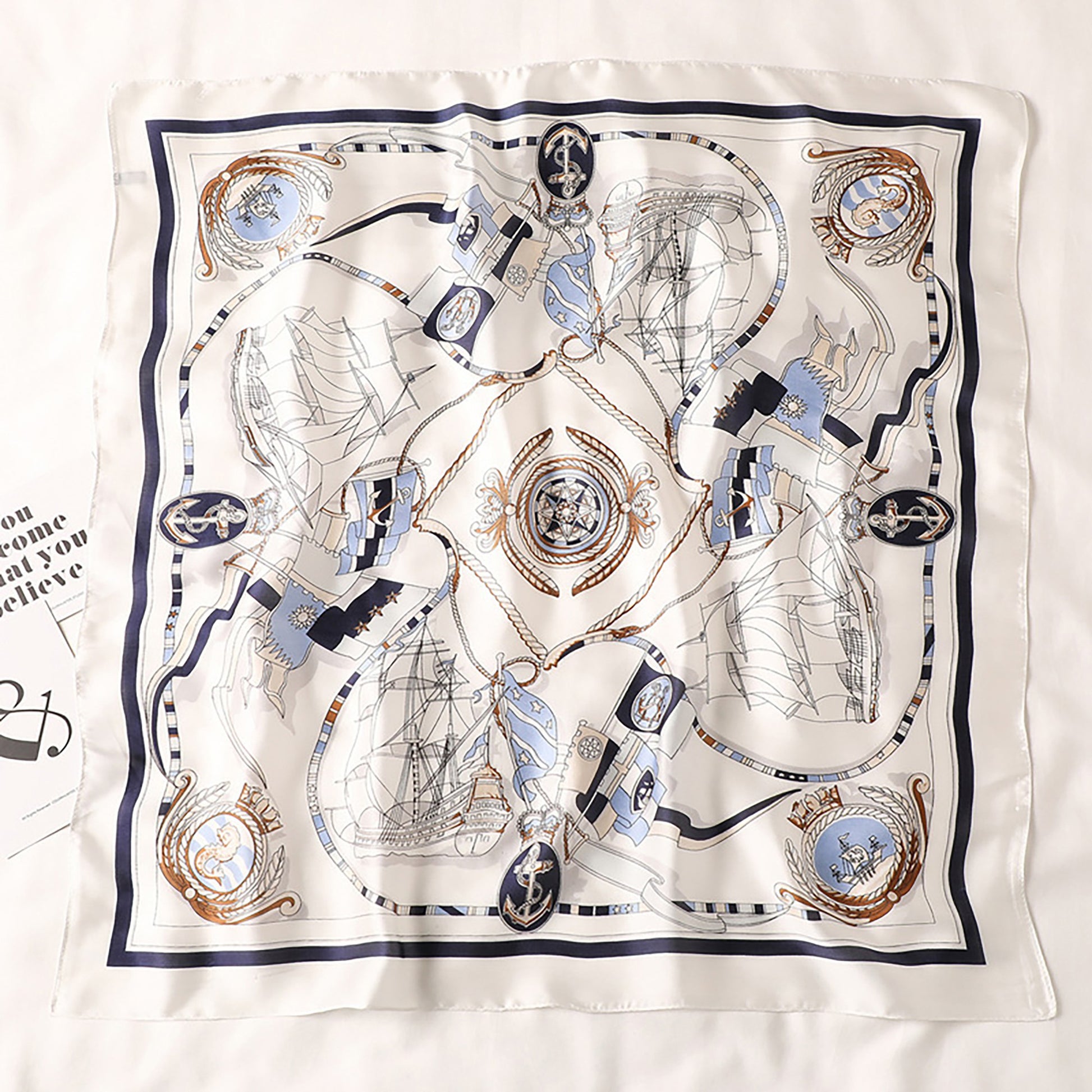 The women's square scarf brings refined elegance with a touch of maritime charm. This smooth satin scarf showcases an intricate nautical pattern framed by bold borders for a timeless, polished look. Its soft, lightweight texture drapes beautifully whether styled as a neck accessory, head wrap, or bag detail. A versatile and chic addition to any fashion-forward wardrobe.