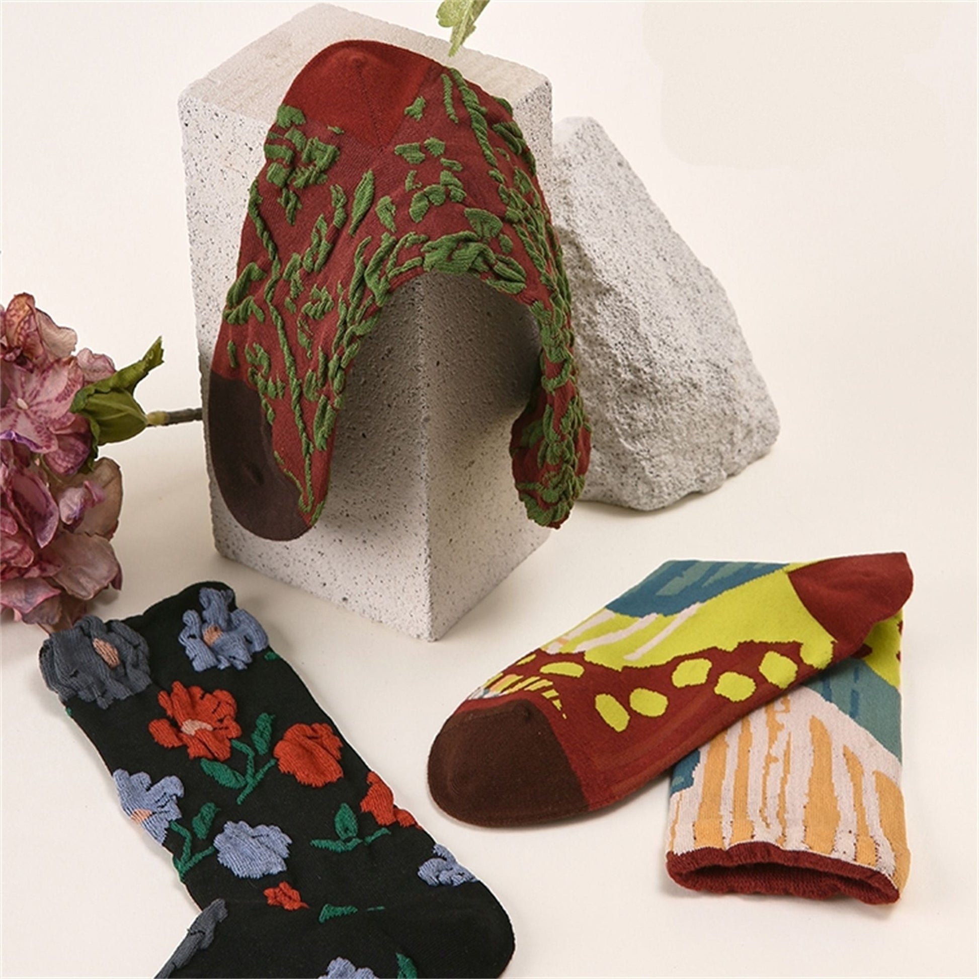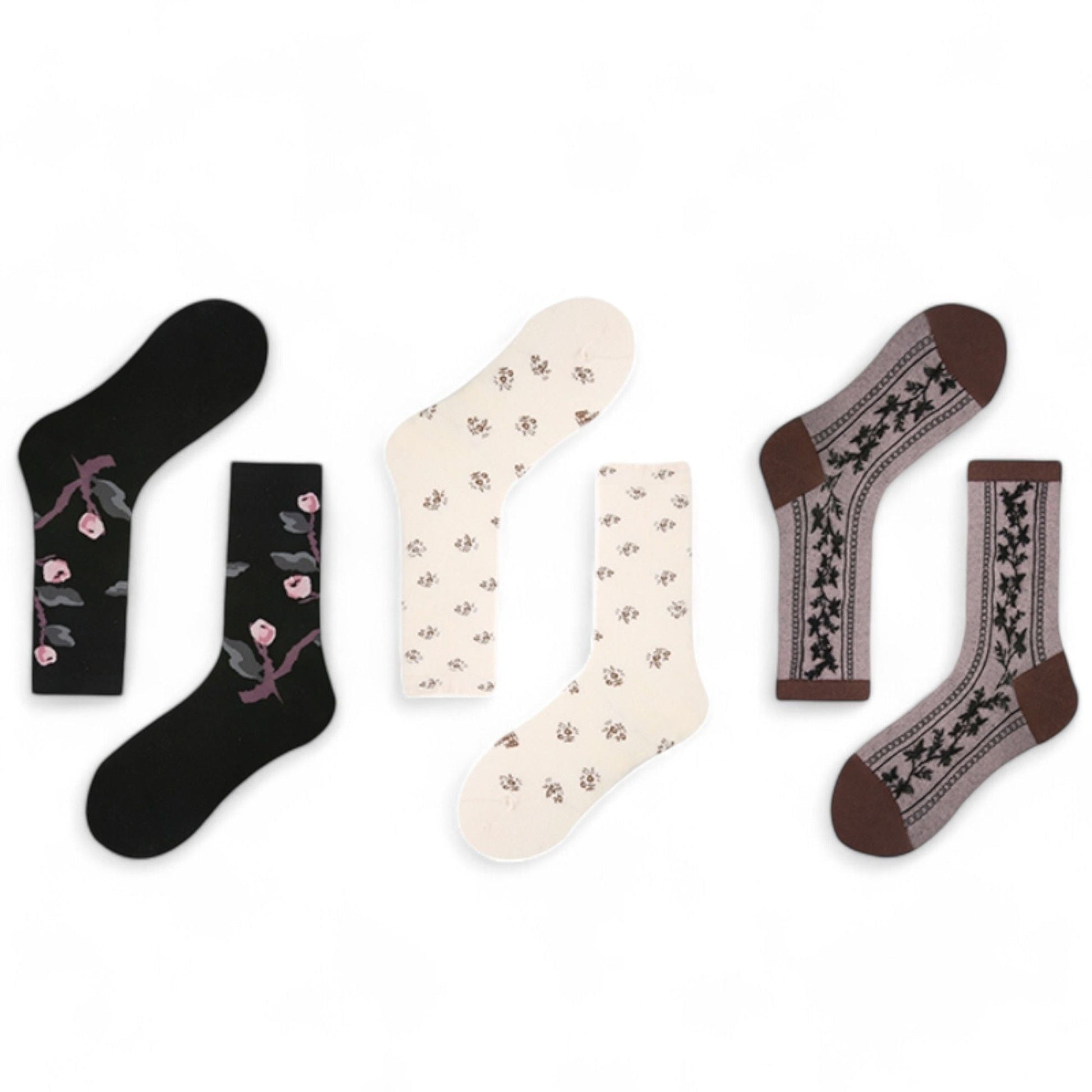 Women's 3-Pack Patterned Crew Socks with Vintage Embroidered Floral and Abstract Prints