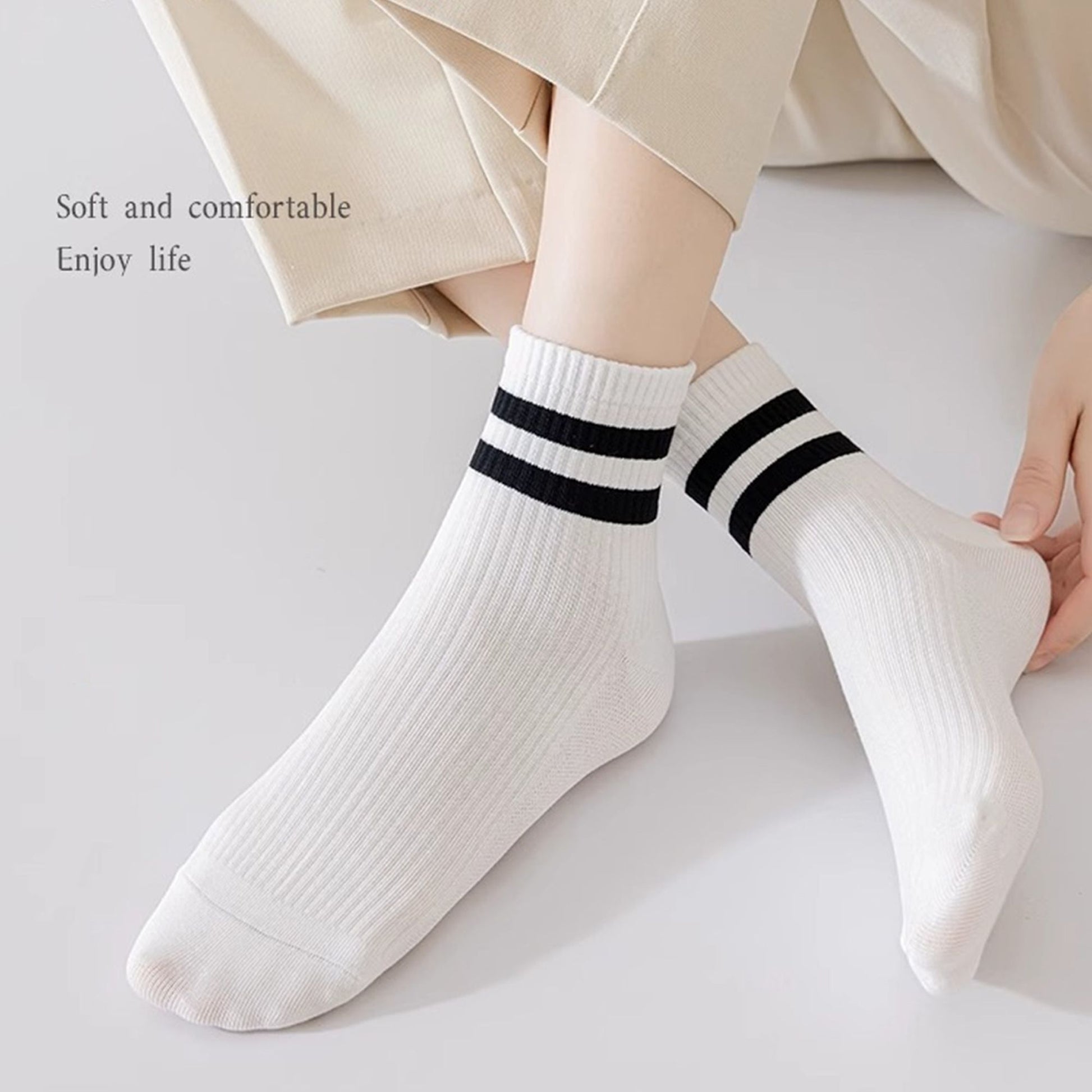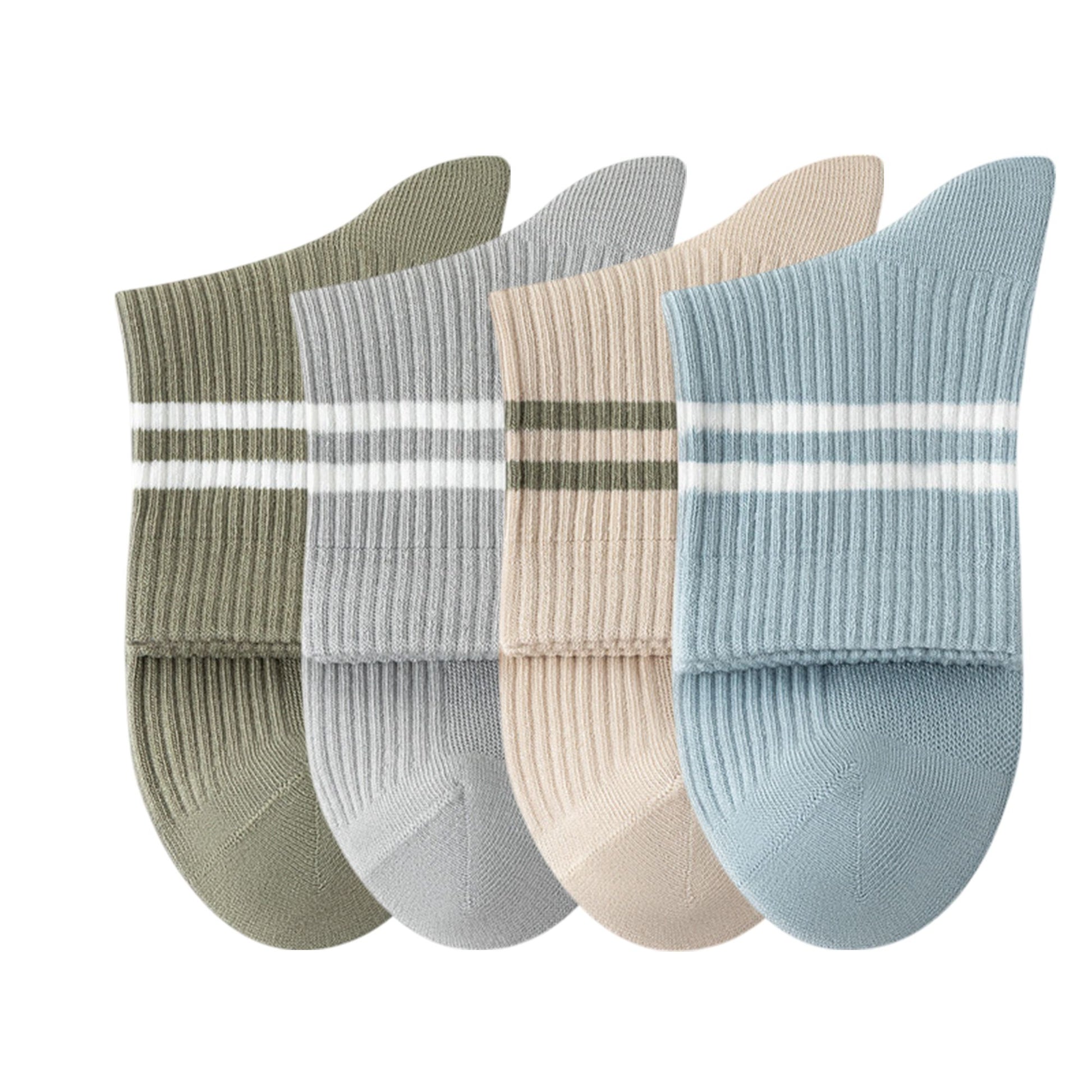 These womens athletic-style crew socks offer a sporty touch with their classic double stripe detail and ribbed knit structure. Designed with soft, stretchable fabric for all-day comfort, they provide a snug yet flexible fit that stays in place. Each 4-pack includes a vibrant mix of contrasting colors, making them a fun and functional addition to any casual wardrobe. Ideal for pairing with sneakers or slides, these socks balance retro style and modern comfort.