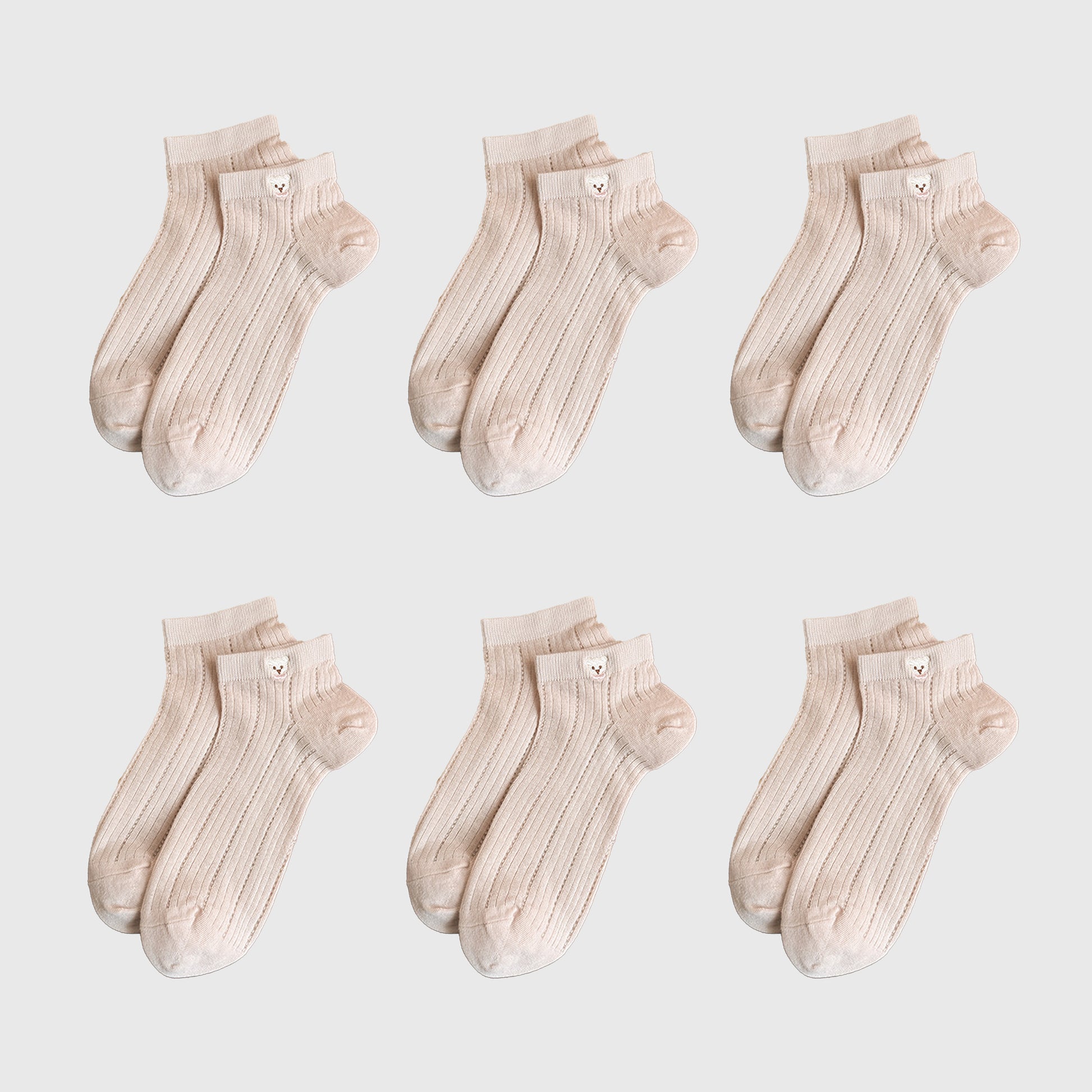 Cute Bear-Embroidered Striped Ankle Socks 6Pk