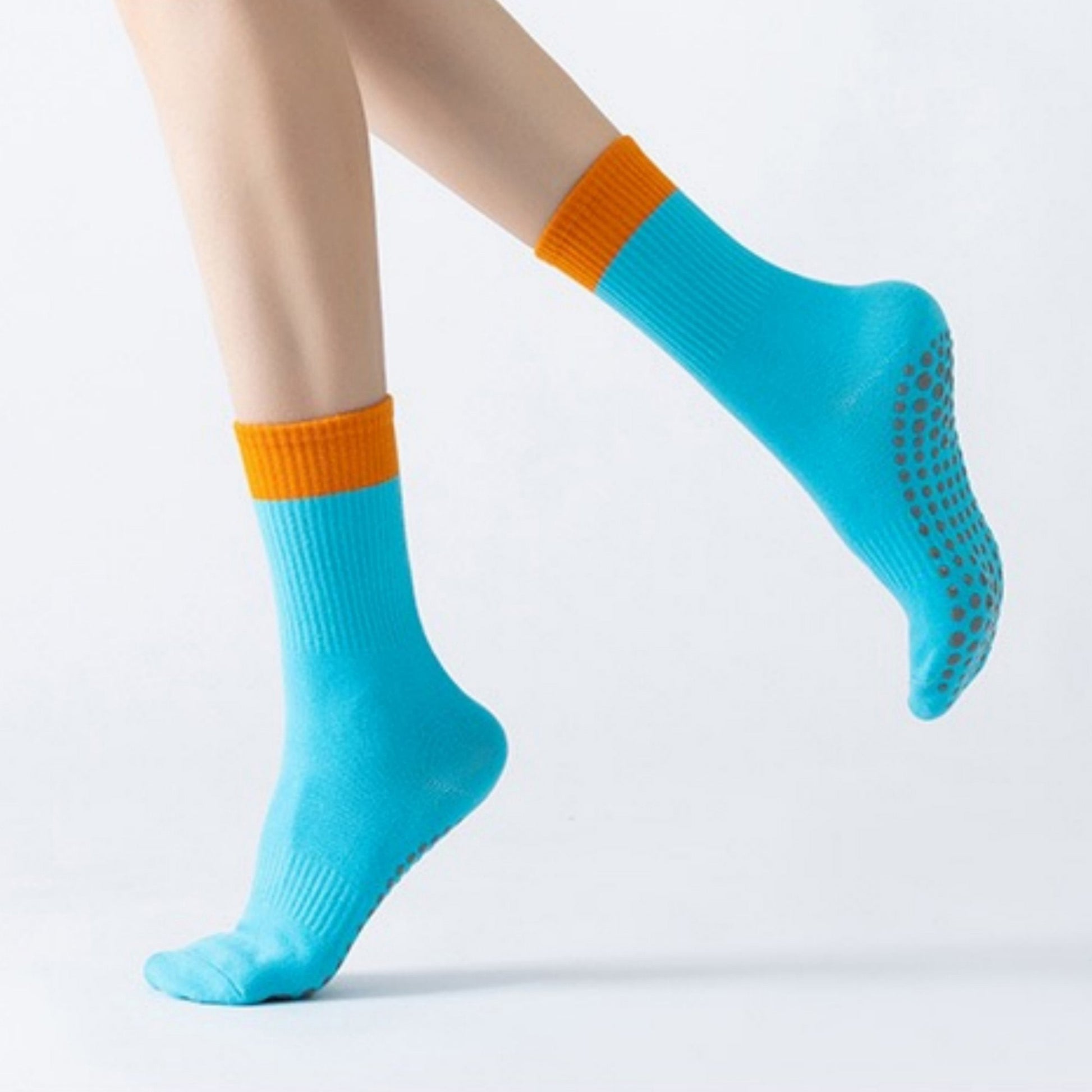 The Anna-Kaci Women's Crew Grip Socks are designed to add style and security to your at-home routine. Featuring a crew-length cut with eye-catching contrast cuffs, these socks also include raised grip textures on the soles to help prevent slipping. Made from soft, breathable fabric, they offer all-day comfort whether you're lounging, stretching, or moving around the house. This 2-pack combines playful design with functional grip support.