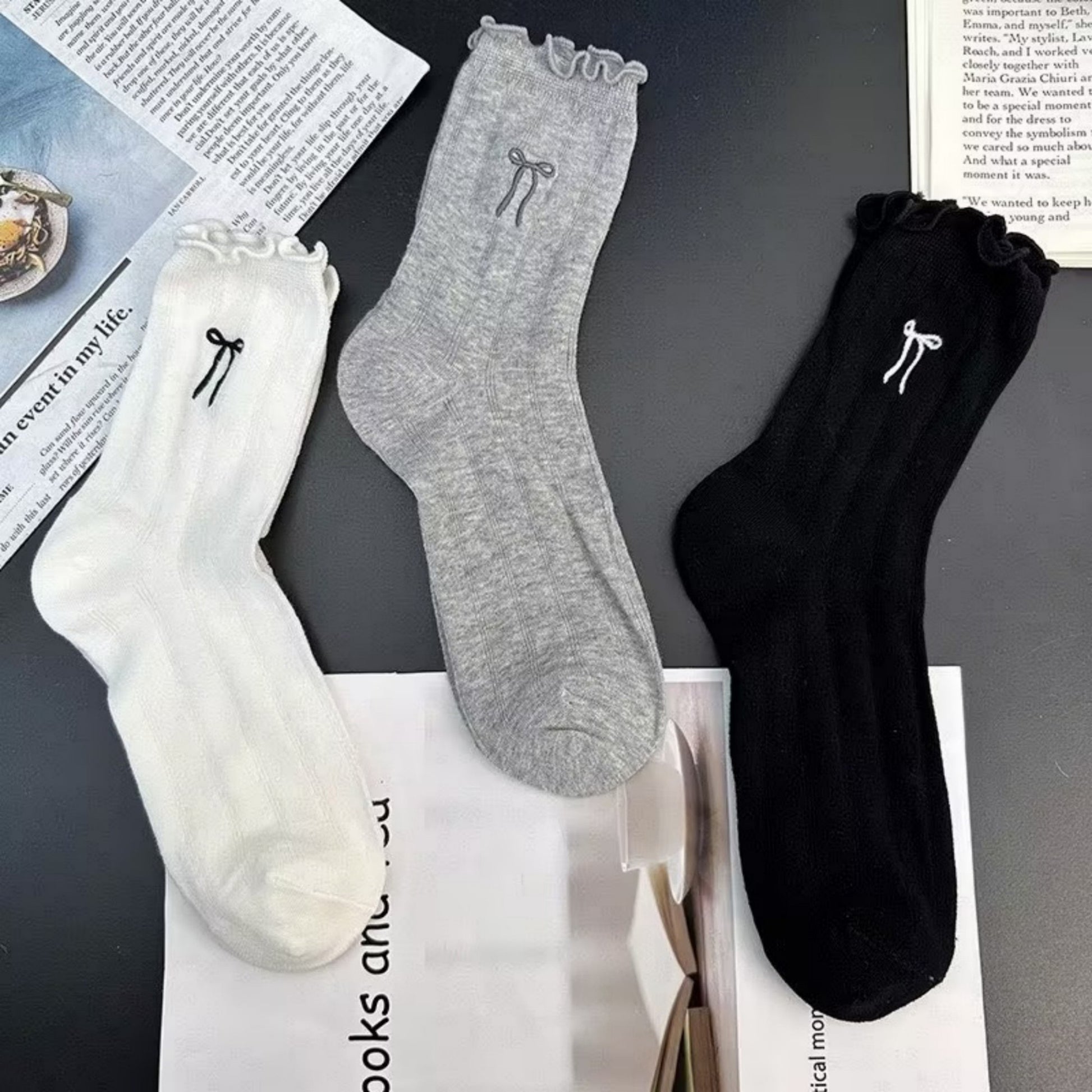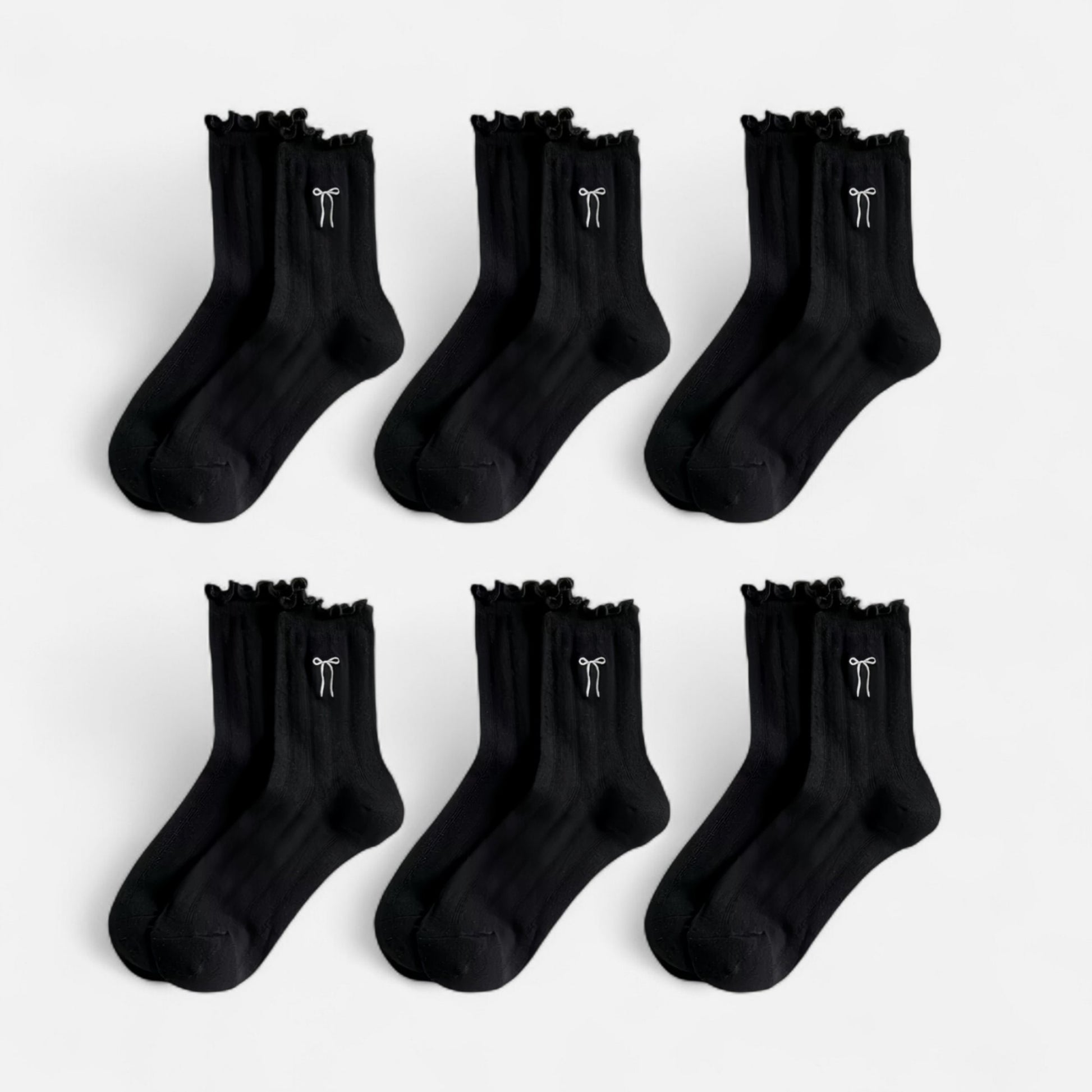 6-Pack Ruffle Trim Crew Socks with Ribbed Texture and Delicate Bow Accent