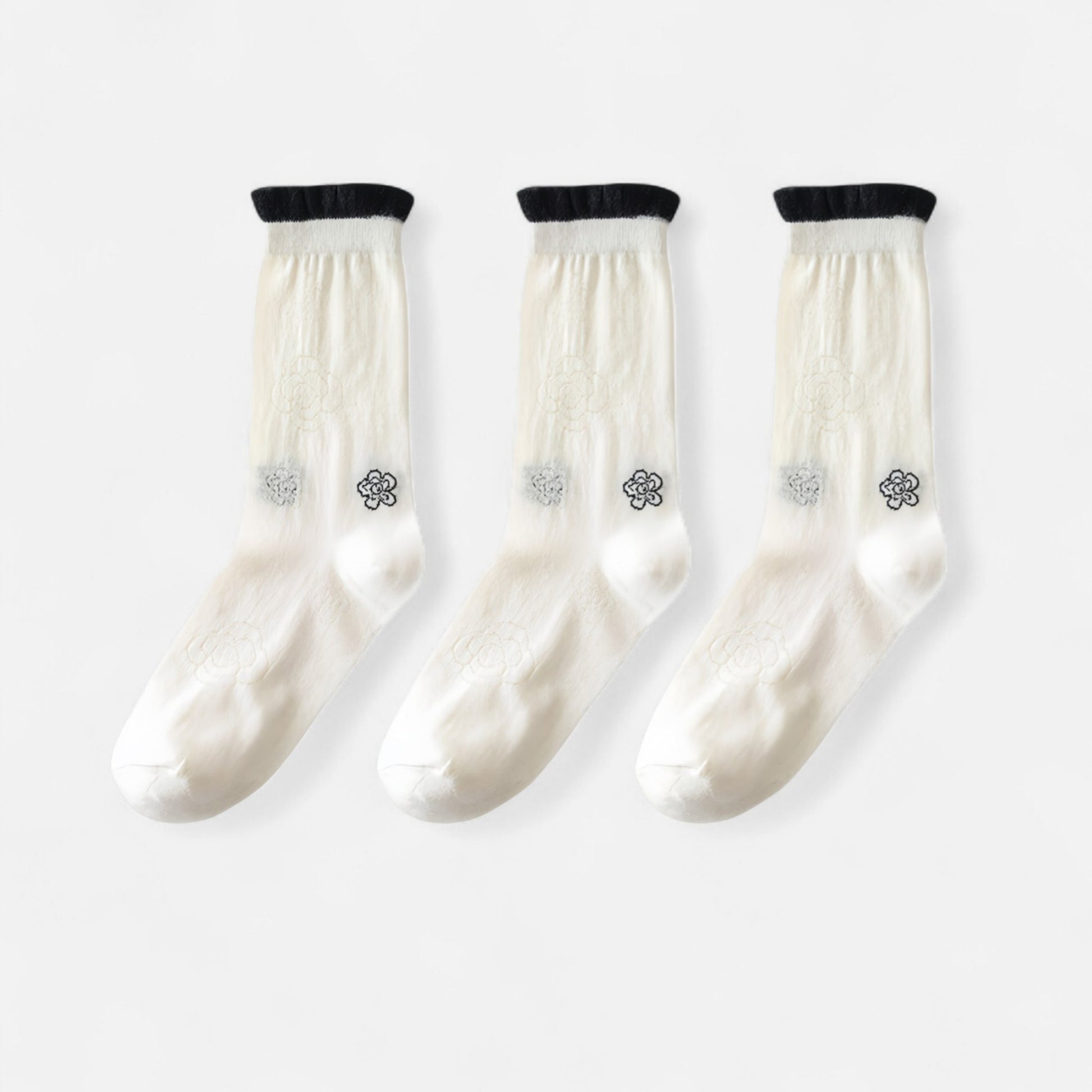 3-Pack Sheer Floral Embroidered Socks with Contrast Ruffle Cuff and Delicate Flower Accents