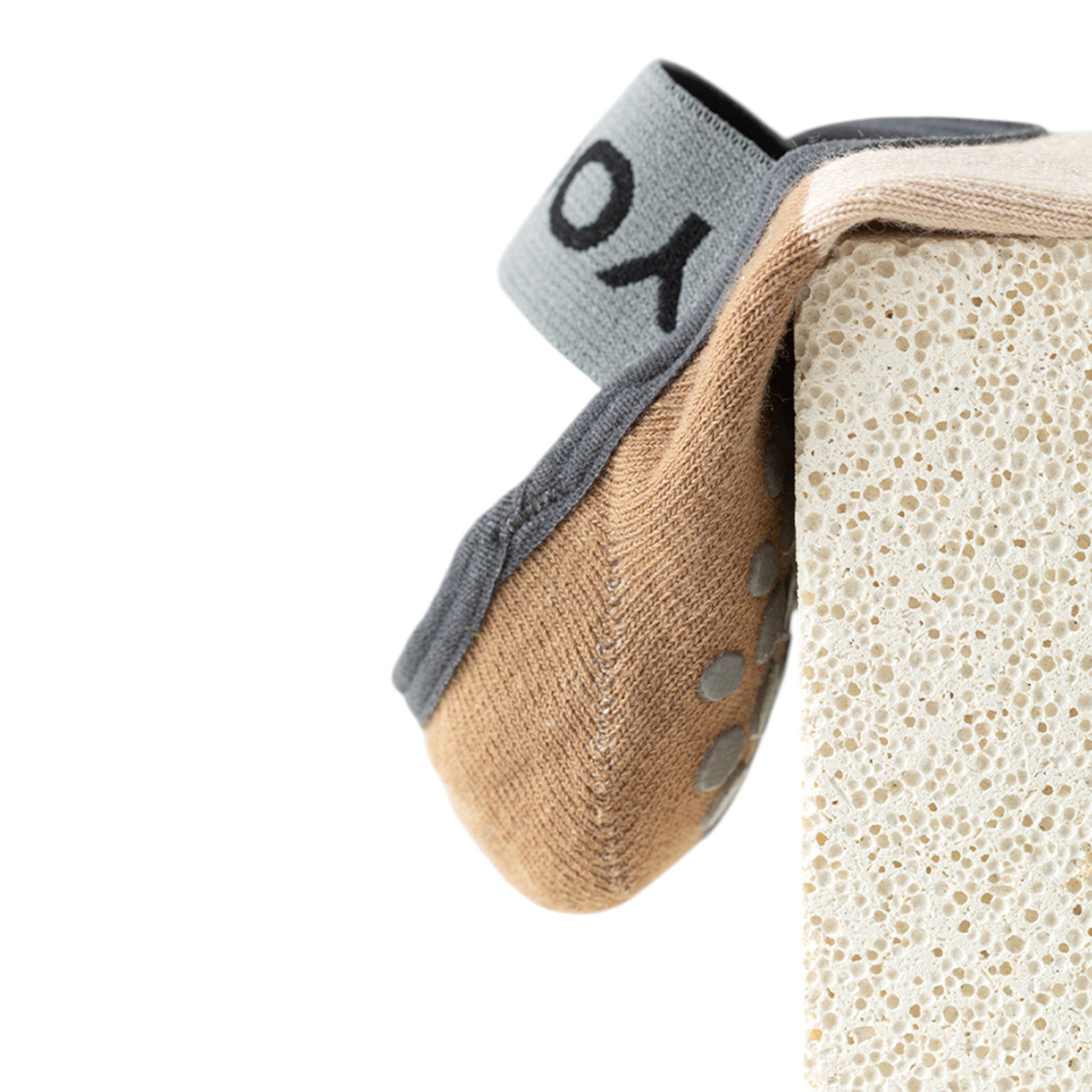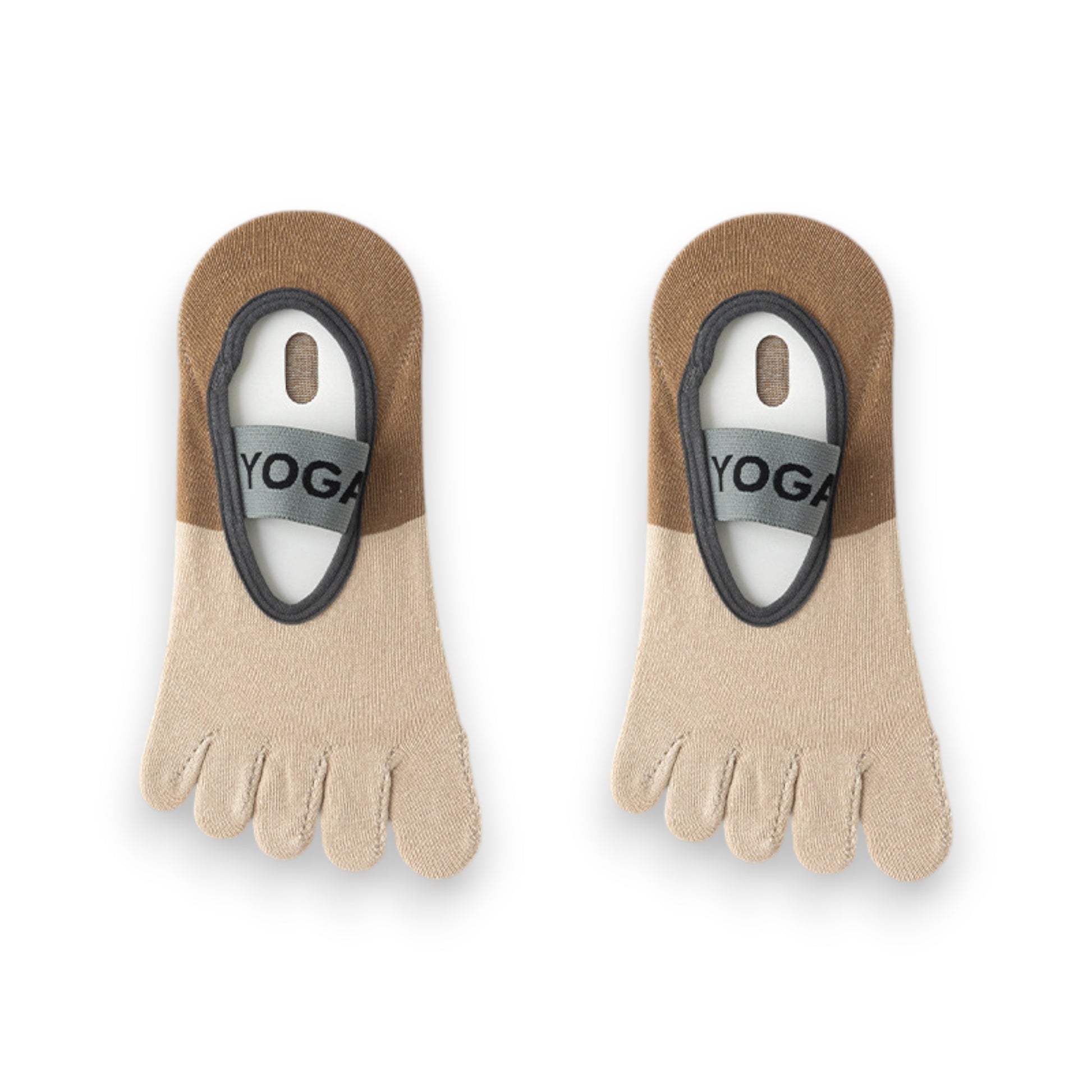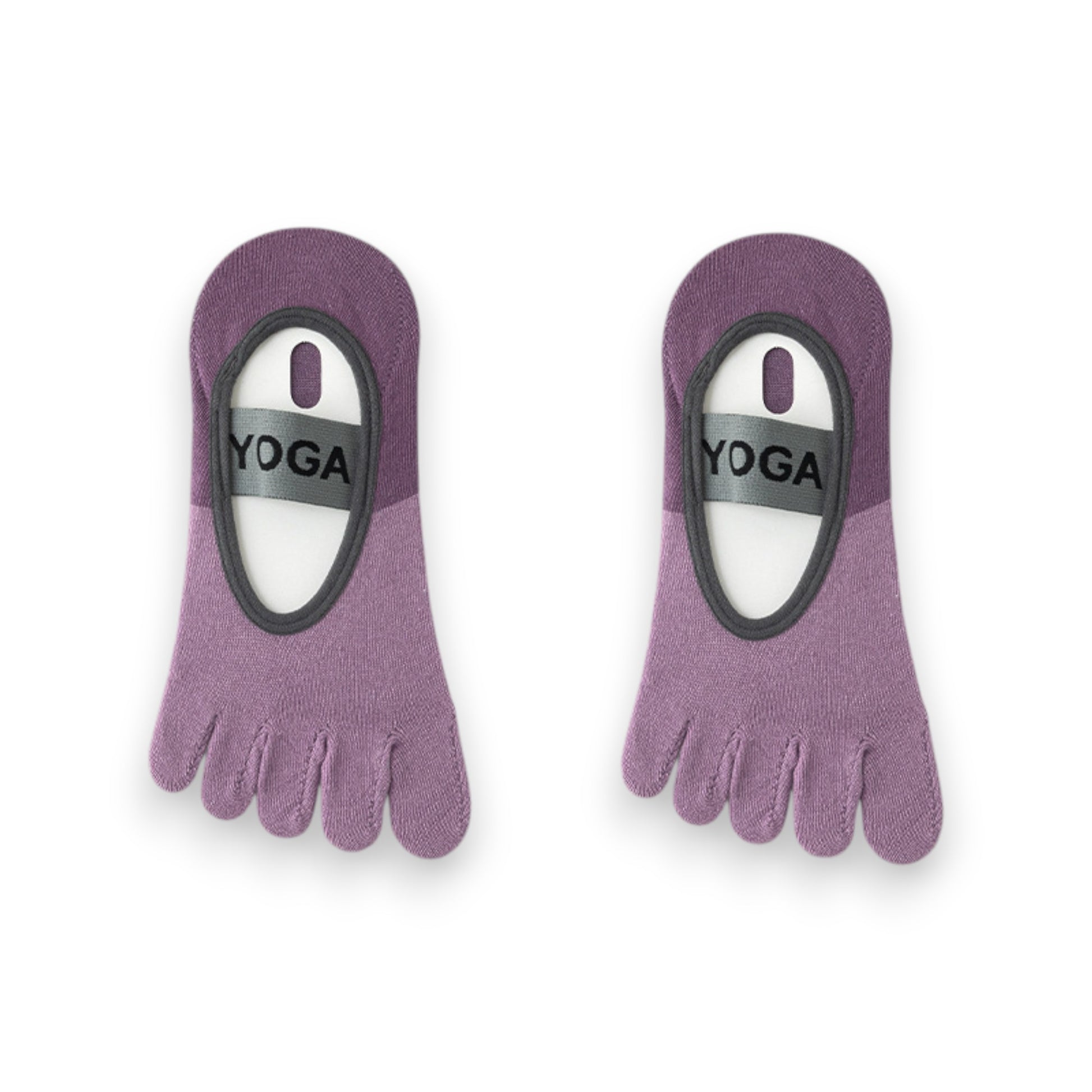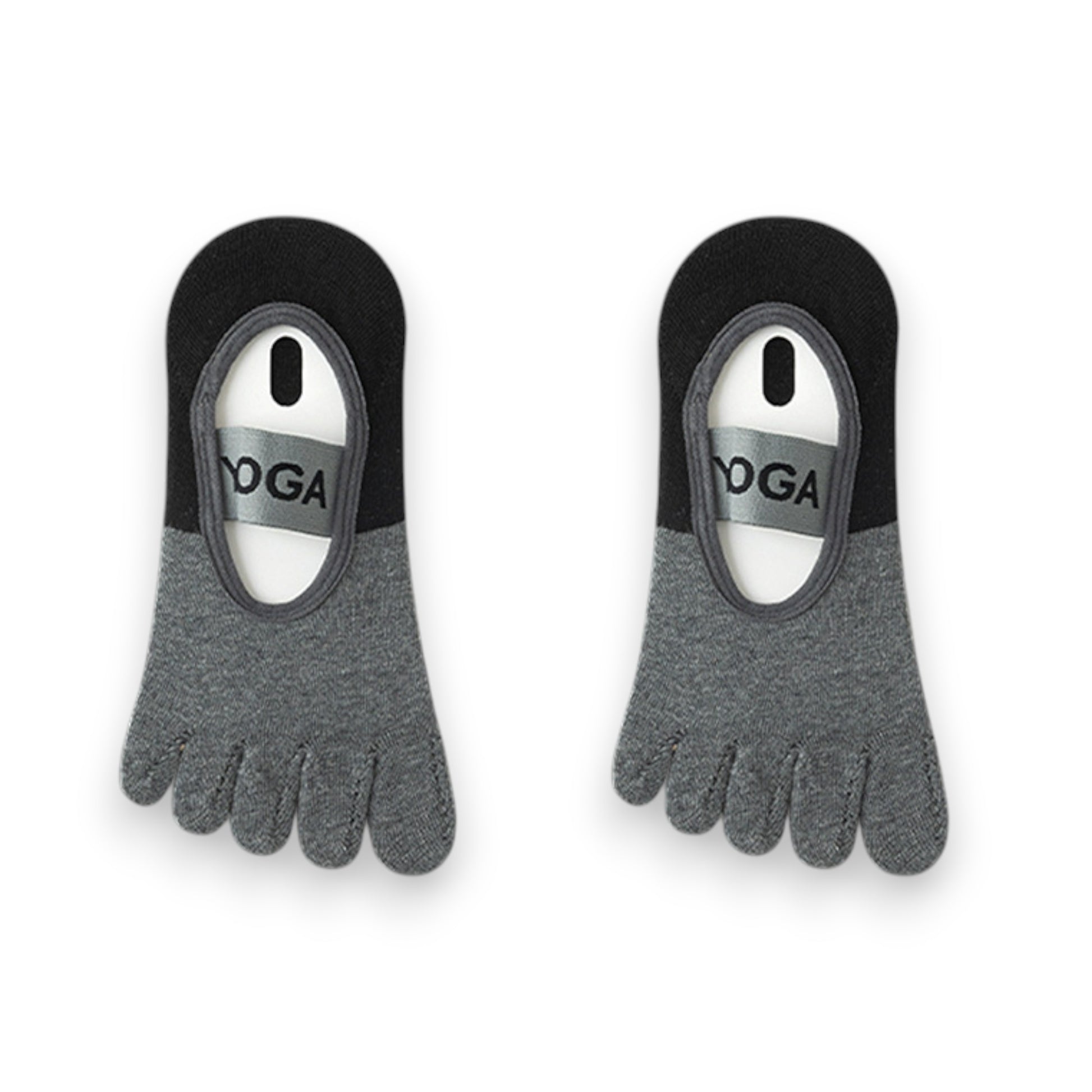 These women's five-toe yoga socks are designed for enhanced grip and stability during workouts. Crafted from soft cotton material, they feature a secure elastic strap across the instep and non-slip grips on the sole for maximum traction. The breathable, flexible design keeps feet comfortable while promoting natural toe movement, making them ideal for yoga, pilates, barre, and other activities.