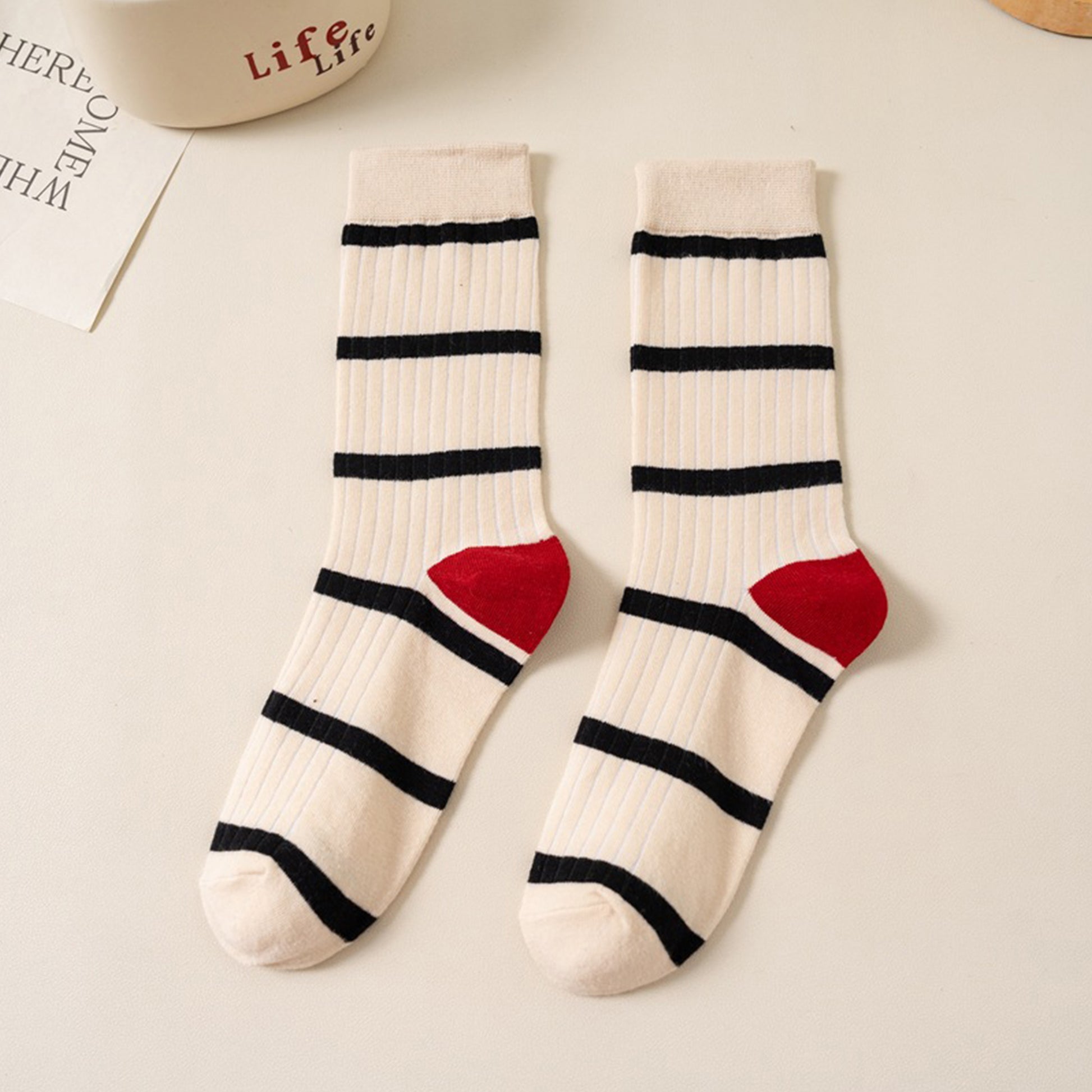 This set includes 3 pairs of stylish mid-calf socks featuring a classic ribbed knit texture and playful horizontal stripe patterns. Made from soft, breathable cotton blend fabric, these socks offer all-day comfort and a snug fit that stays in place without digging in. The reinforced heel and toe provide added durability, while the vibrant designs bring a cheerful touch to any outfit. Perfect for pairing with sneakers, loafers, or ankle boots for a fun yet practical everyday look.