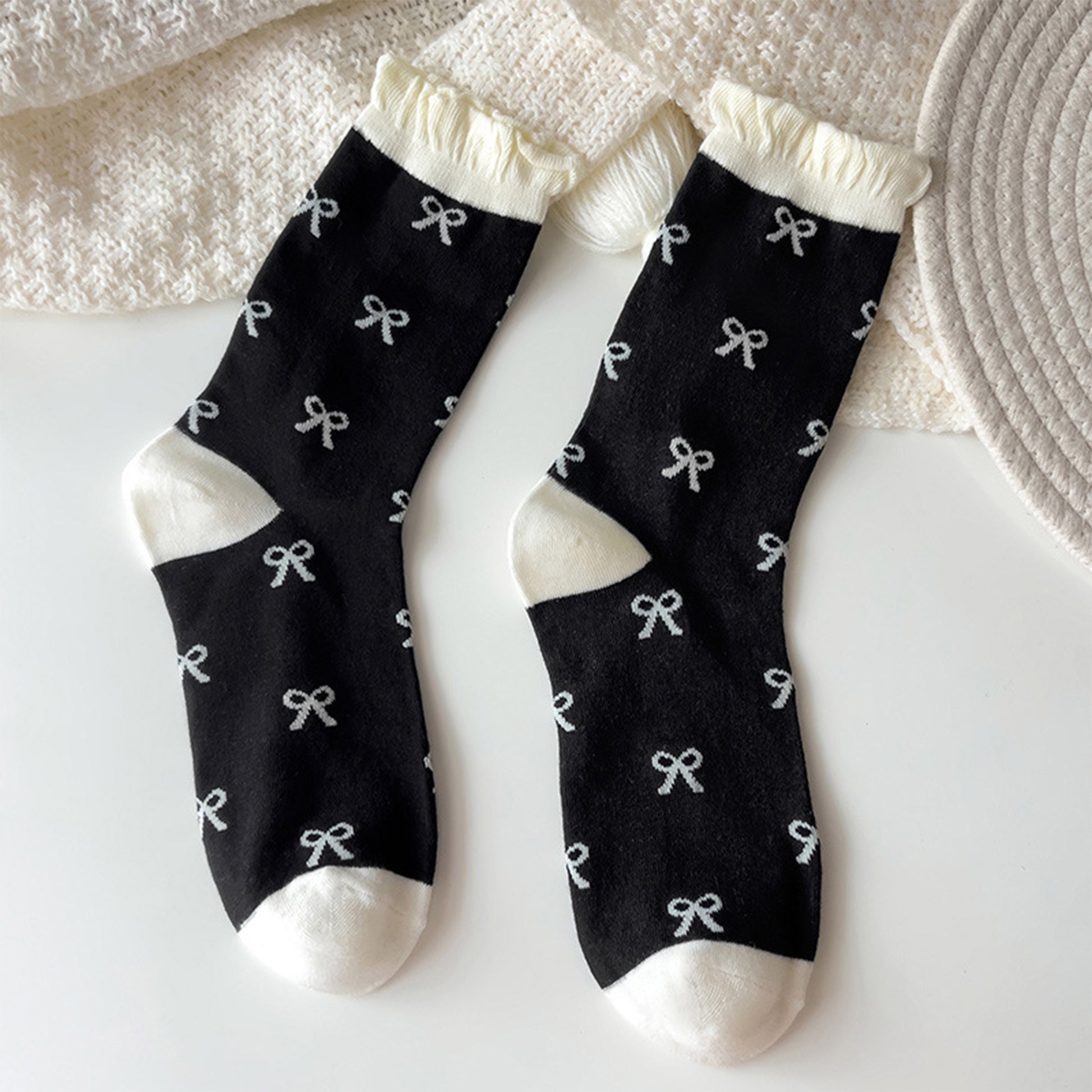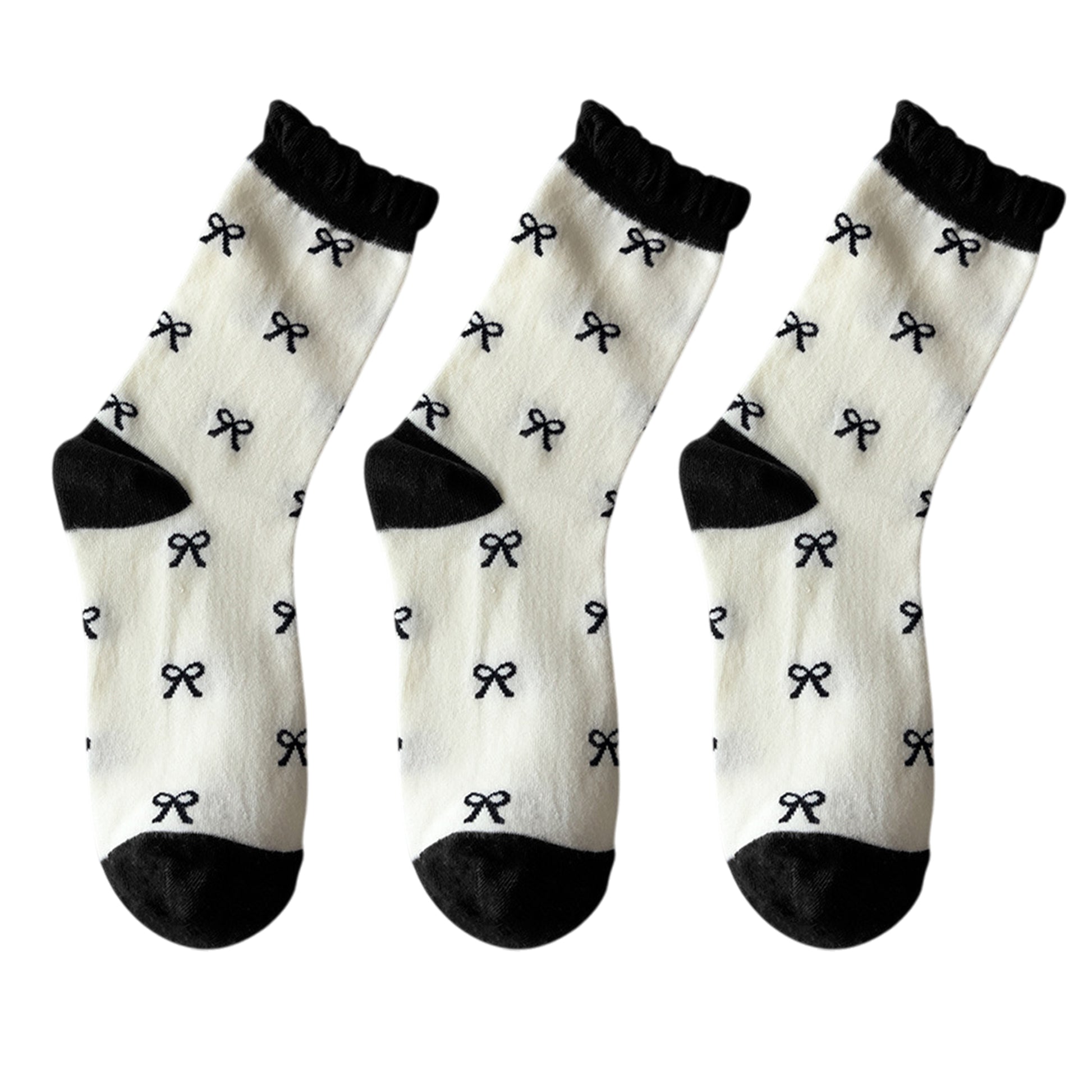 3 Pairs Women's Mid-Calf Socks with Bow Pattern and Ruffled Cuff