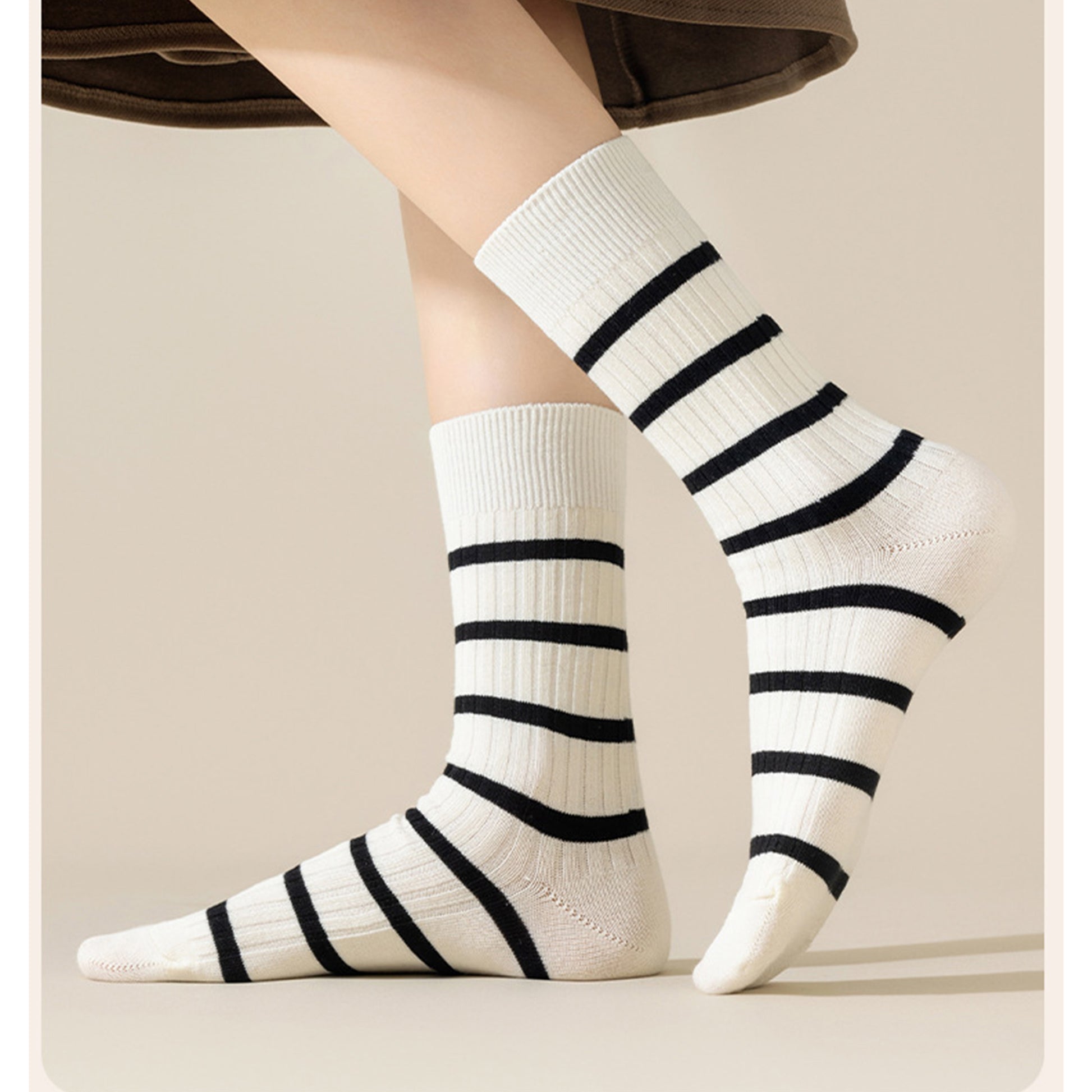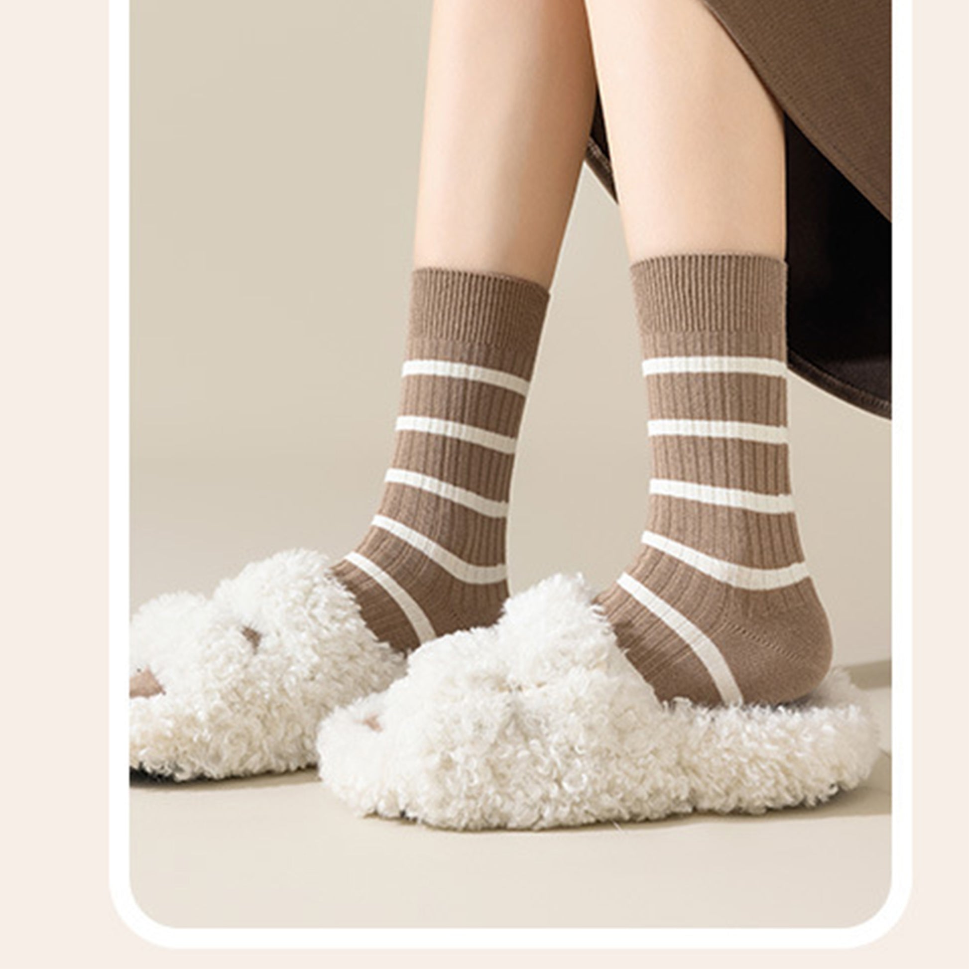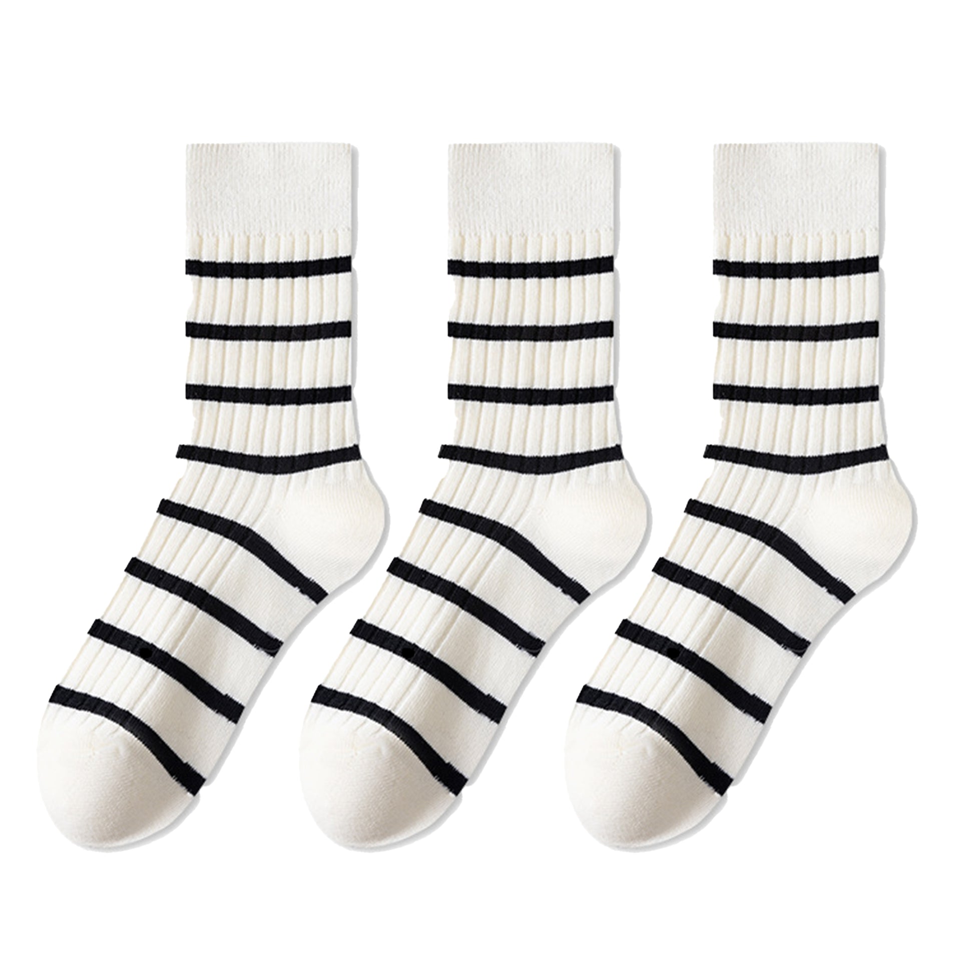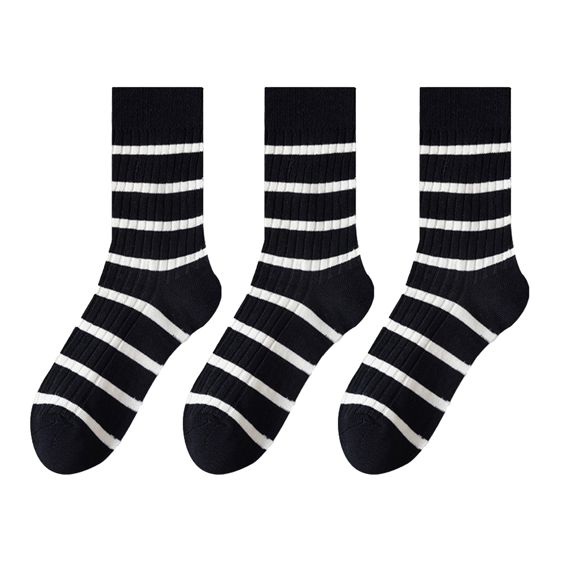 3 Pairs Women's Striped Crew Socks feature a timeless ribbed knit design with bold horizontal stripes, blending everyday comfort with classic style. Made from an 80% cotton blend, these socks are soft, breathable, and resistant to pilling for lasting wear. Their mid-calf crew fit provides versatile styling with sneakers, loafers, or loungewear. With three pairs included, this set is perfect for stocking up on durable, fashionable essentials.