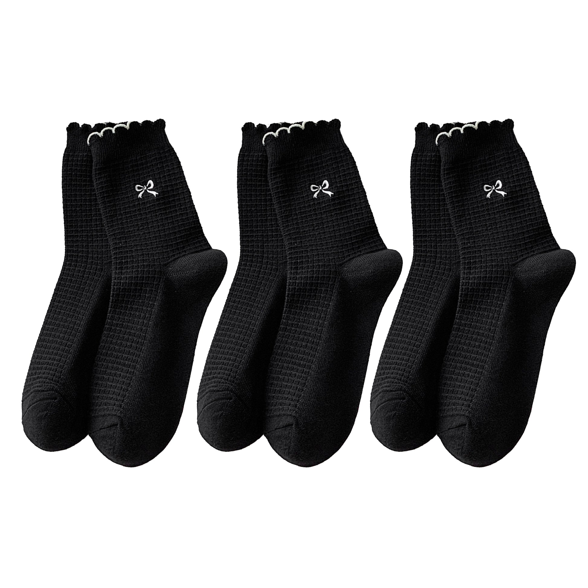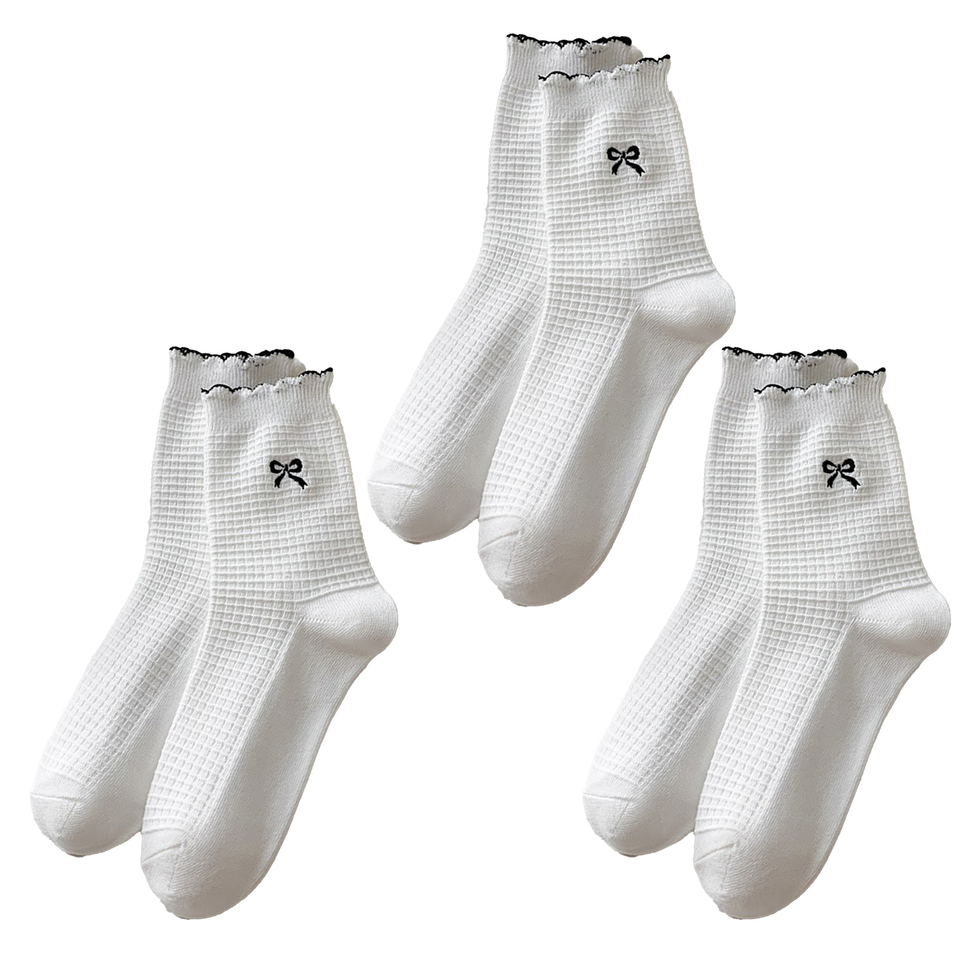 3 Pairs Knit Socks with Waffle Texture Bow Embroidery Ruffled Edge Ribbed Cuffs