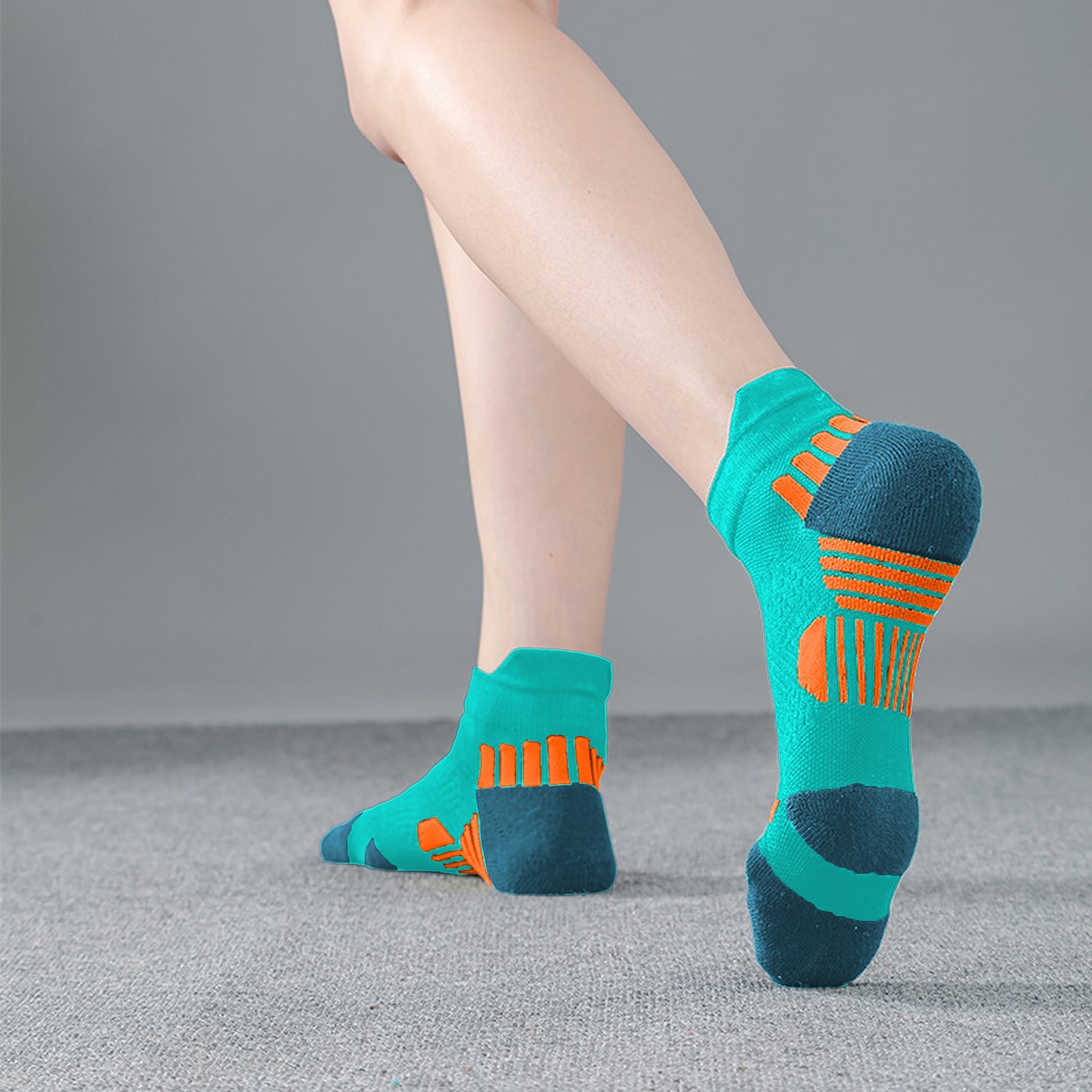 Step up your athletic sock game with our Men's Teal Athletic Ankle Socks featuring eye - catching orange accents. These socks are designed to blend performance and style seamlessly, making them perfect for both intense workouts and everyday activities. Crafted from breathable, moisture - wicking fabric, they effectively draw sweat away from your feet, keeping them dry and comfortable even during the most rigorous exercise routines or long days on the go.
