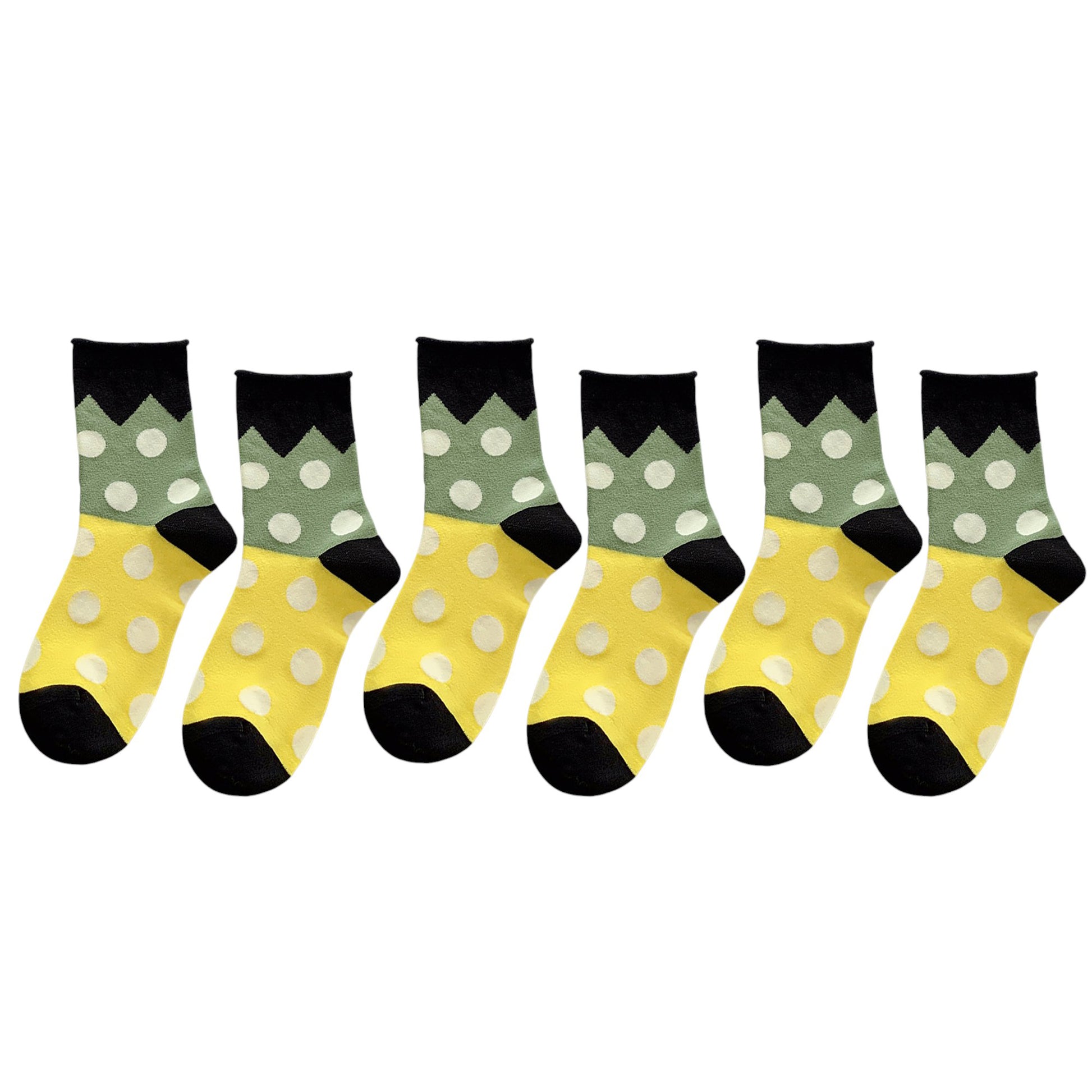 Elevate your sock game with our Women's Color - Blocked Polka Dot Cotton Ankle Socks, the ultimate choice for those who love to stay on - trend. These socks feature a bold color - blocking design with bright yellow, fresh green, and sleek black, making them a statement piece that's sure to turn heads. The classic white polka dots scattered across the colorful background add a playful and charming element, blending timeless style with modern fashion.