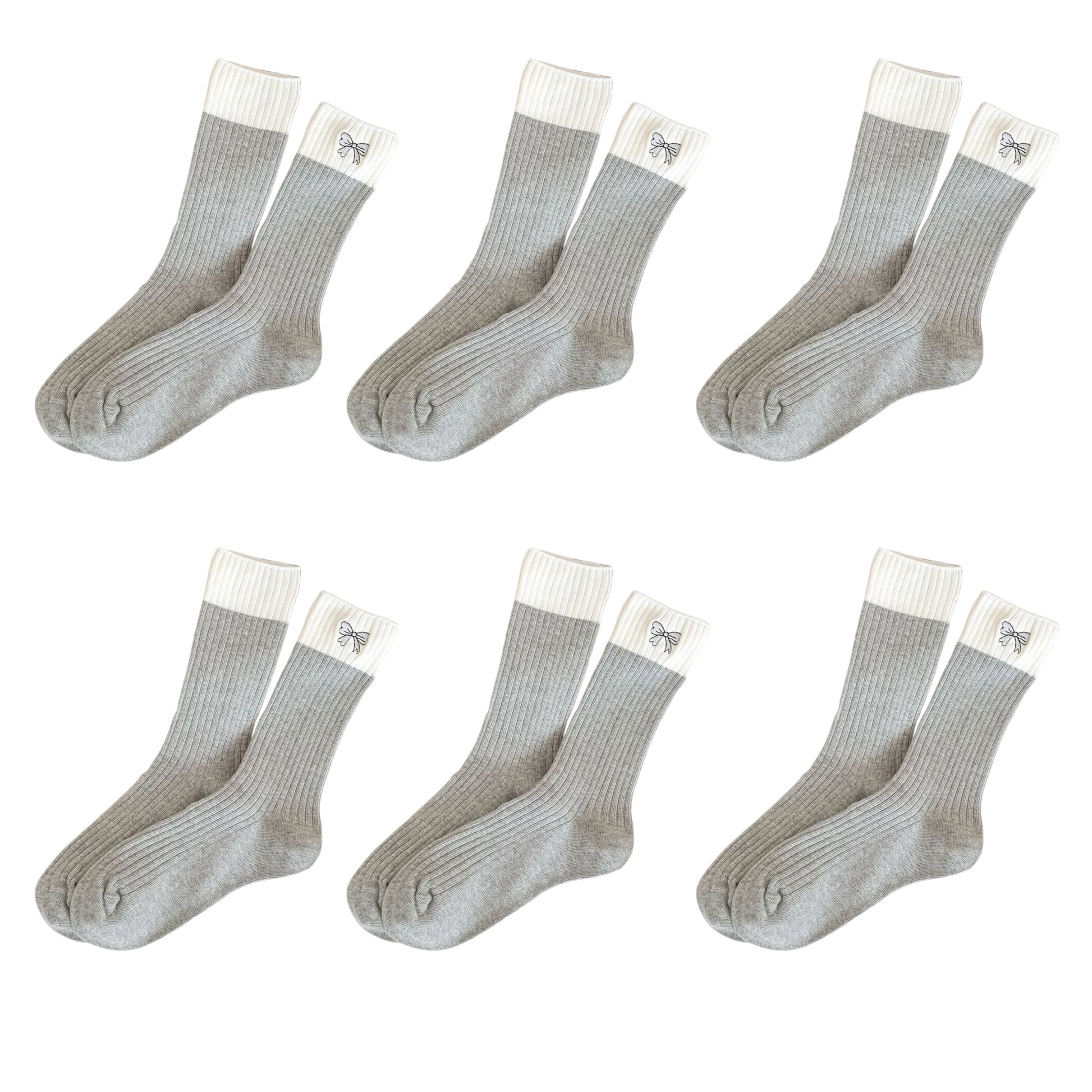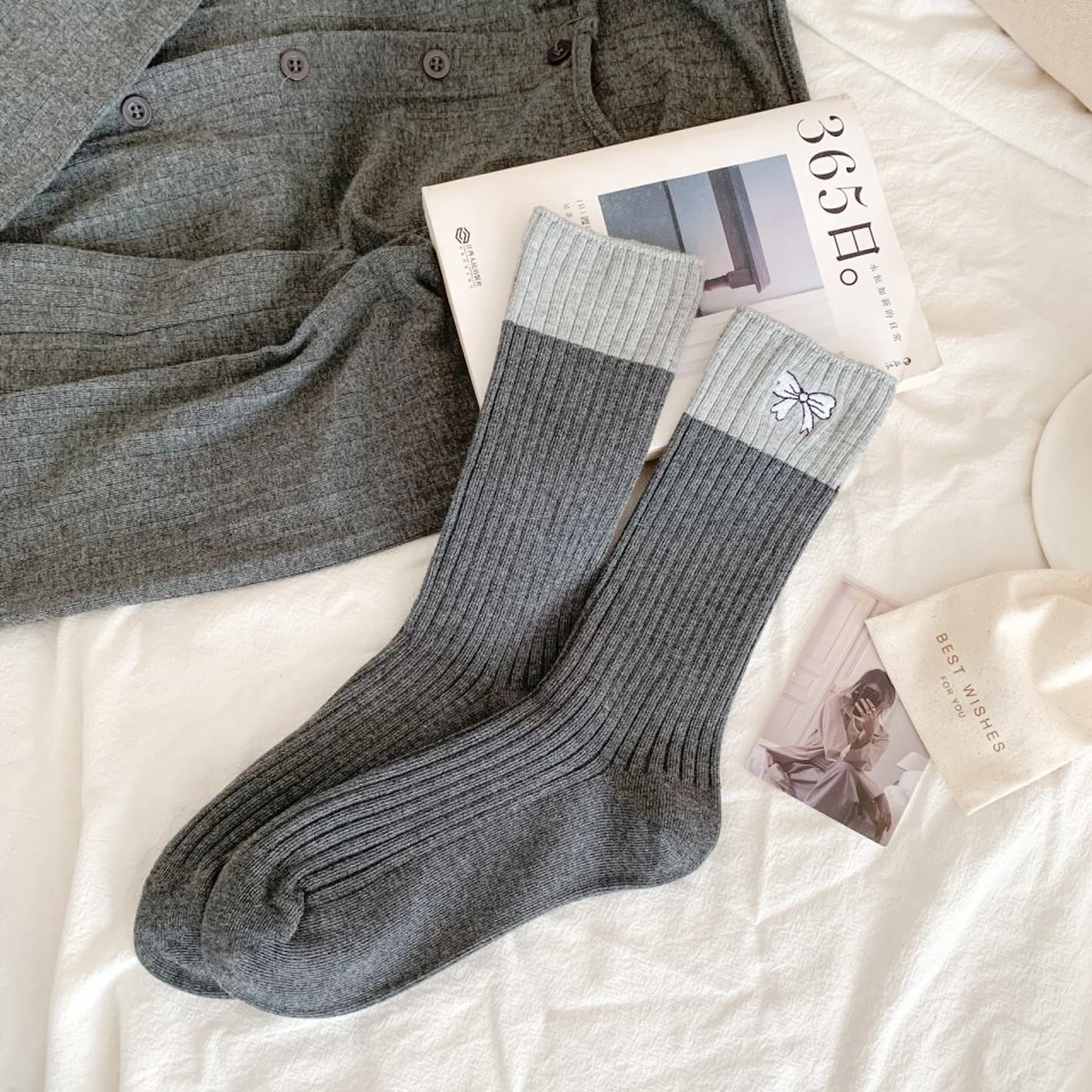 Elevate your sock game with our Women's Gray Color - Block Knee - High Socks featuring charming bow embroidery. These socks seamlessly blend sophistication and sweetness, making them a must - have addition to your wardrobe. The sleek color - block design, combining dark and light gray, brings a modern and trendy vibe, while the delicate bow embroidery on the cuff adds a touch of femininity.