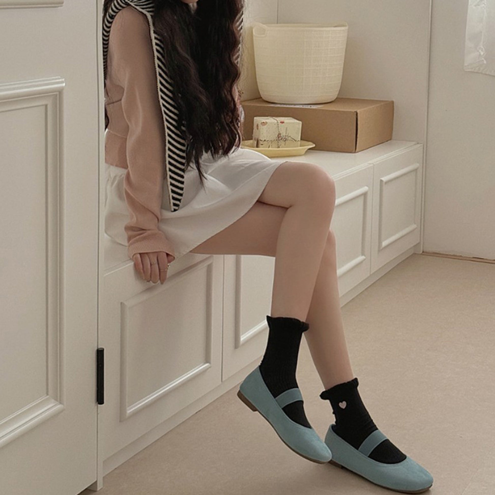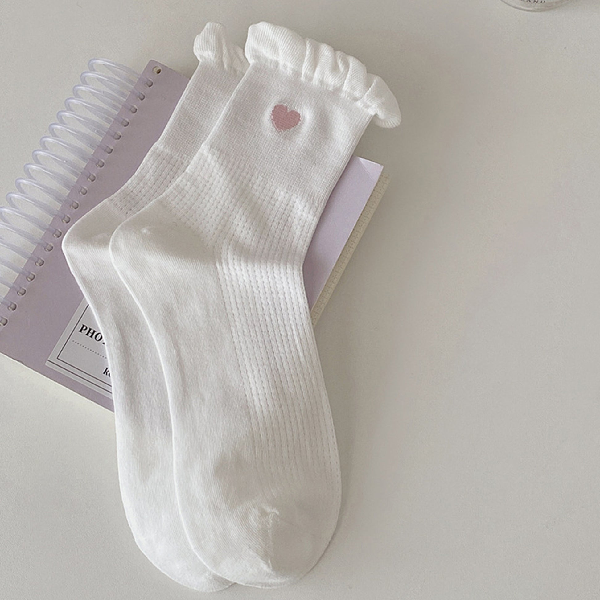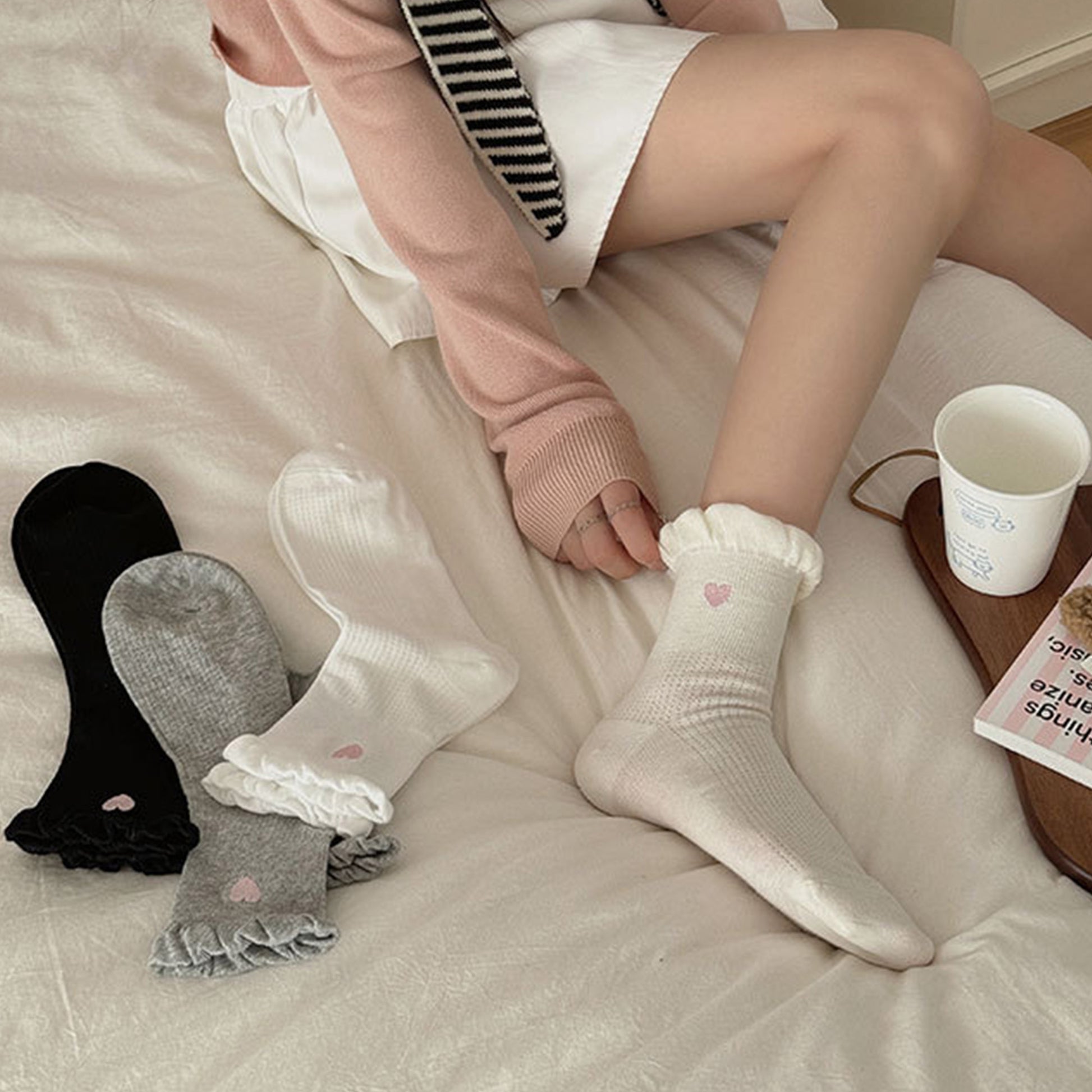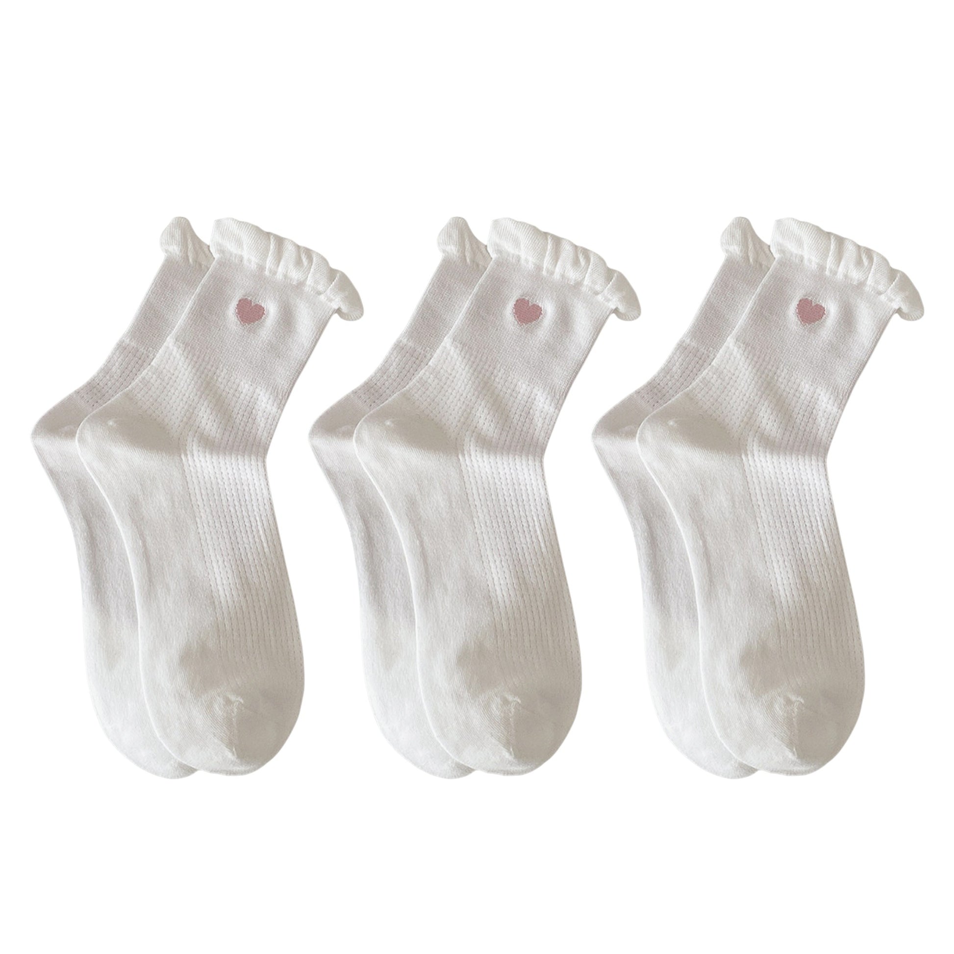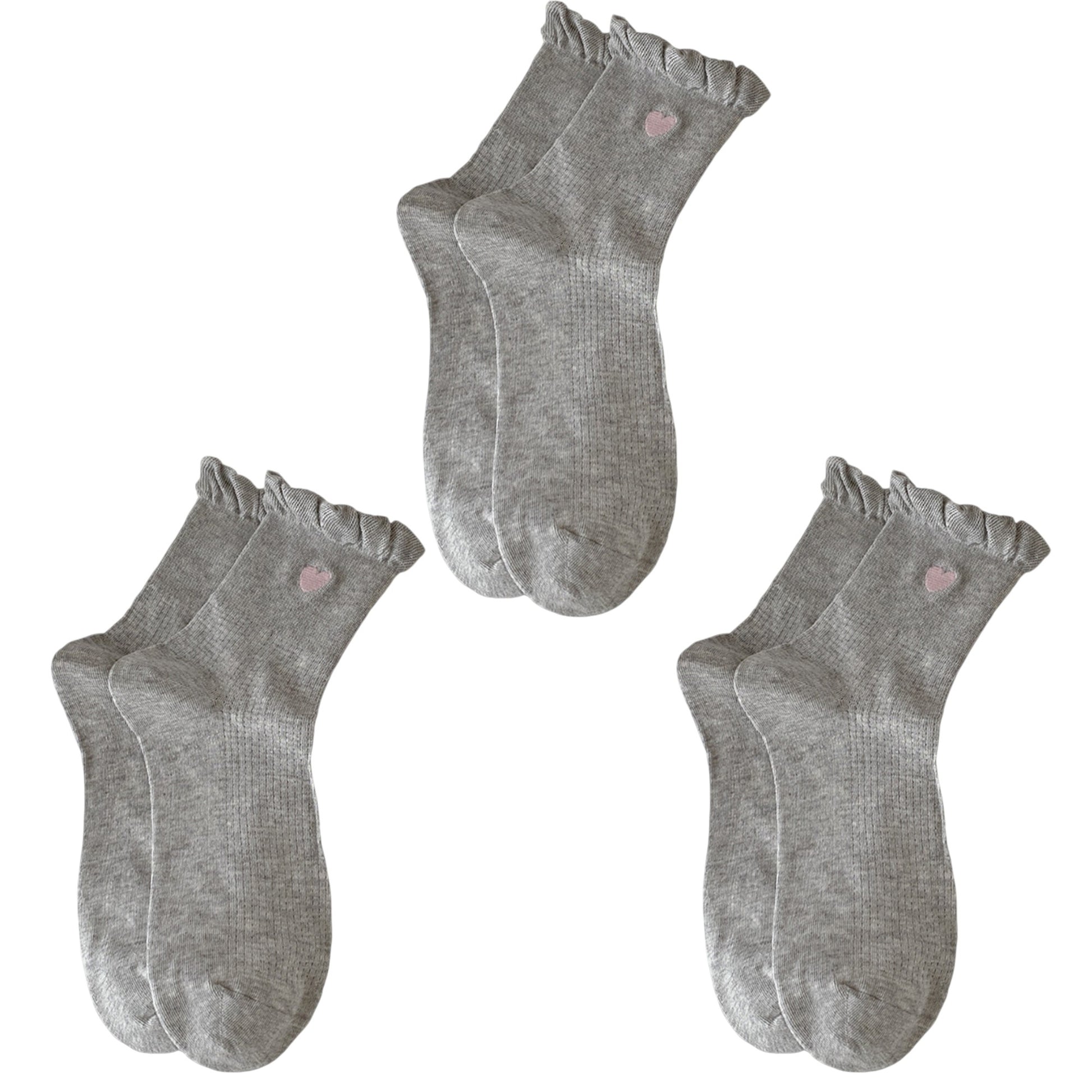 3-Pack Breathable Cotton Blend Socks with Ruffle Trim and Heart Embroidery