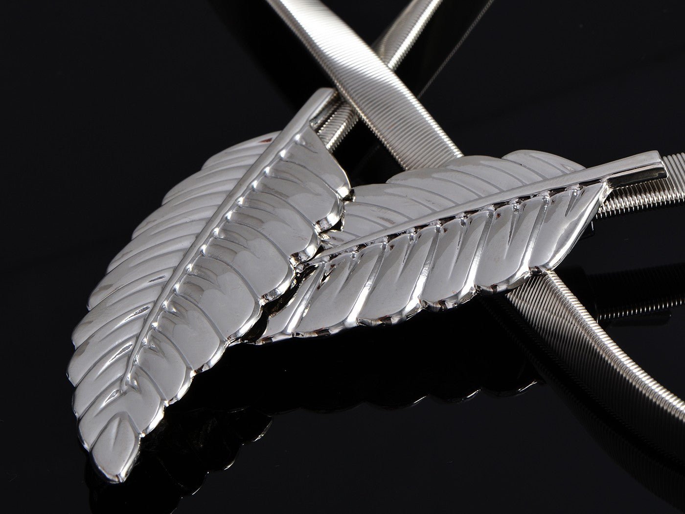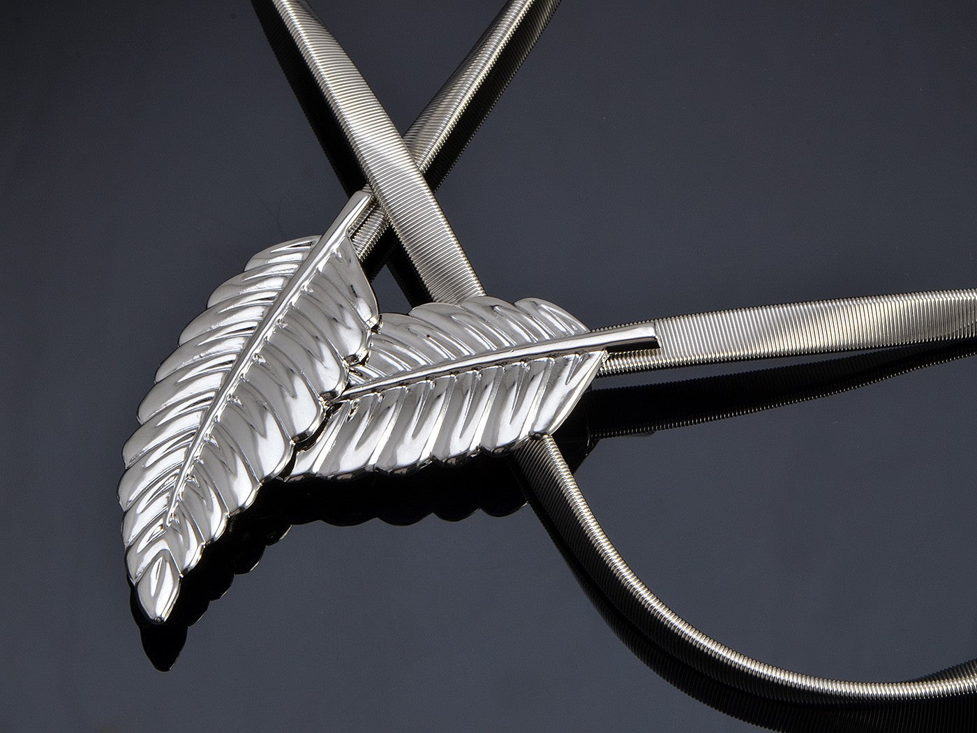 • Shiny belt with leaf design and hook closure.